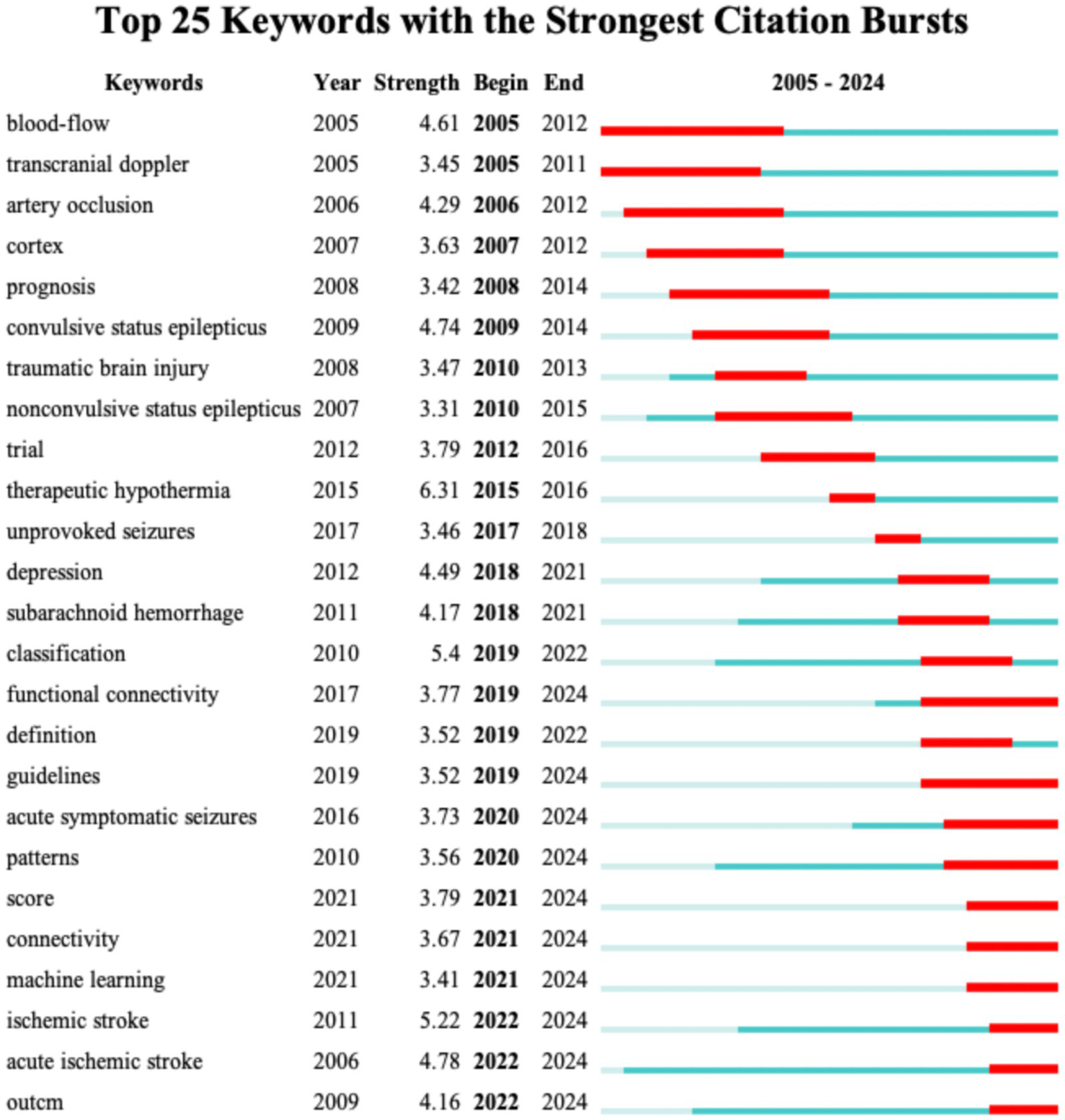 The study collected data from the Web of Science Core Collection database, selecting publications related to stroke and EEG from 2005 to 2024. Visual analysis tools such as VOSviewer and CiteSpace were utilized to build knowledge maps of the research field, analyzing the distribution of publications, authors, institutions, journals, and collaboration networks. Additionally, co-occurrence, clustering, and burst detection of keywords were analyzed in detail.