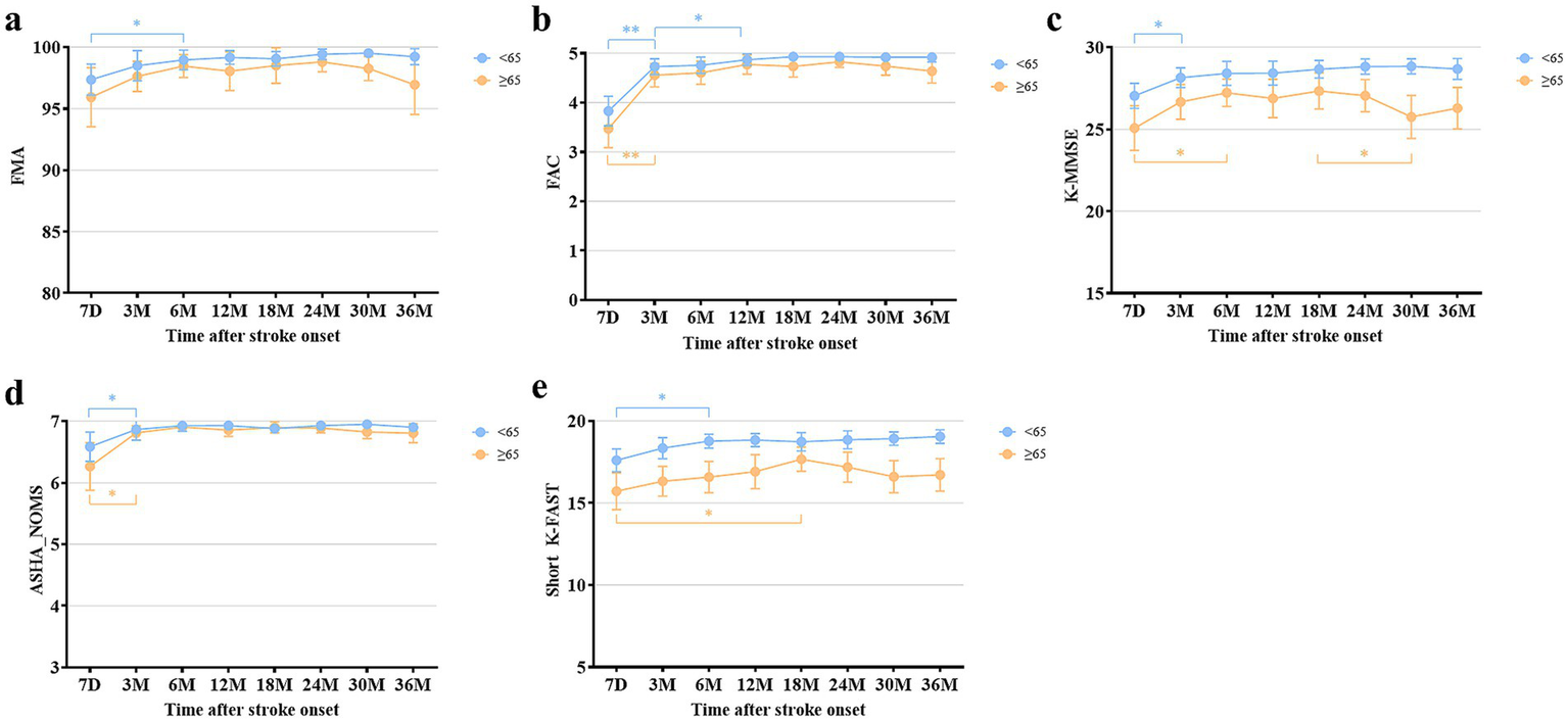 Comparison of multifaceted functional outcomes at each time point after stroke onset between the young and old patients. (a) Fugl-Meyer Assessment. (b) Functional Ambulation Category. (c) Korean Mini-Mental State Examination. (d) American Speech-Language-Hearing Association National Outcome Measurement System Swallowing Scale. (e) Short version of the Korean Frenchay Aphasia Screening Test. All data are presented as mean values with 95% confidence intervals. *p < 0.05, **p < 0.001, compared between each time point using paired t-test and Wilcoxon signed-rank test, with Bonferroni correction.