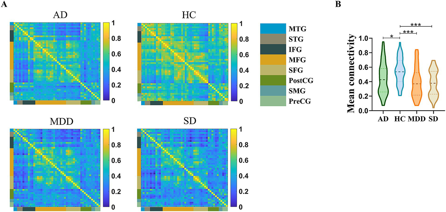 (A) Mean channel-channel connectivity of four groups. (B) Statistical differences among four groups. The HC group had a significantly higher mean channel-to-channel connectivity strength than the AD, MDD, and SD groups. *p < 0.05 and ***p < 0.001.