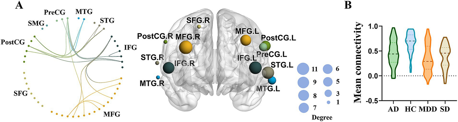 (A) Significant network differences among four groups identified by NBS (left panel), while the size of the node on the right panel indicates the number of connections. (B) Mean functional connectivity of the significant network in MDD, AD, and SD compared to HC group.