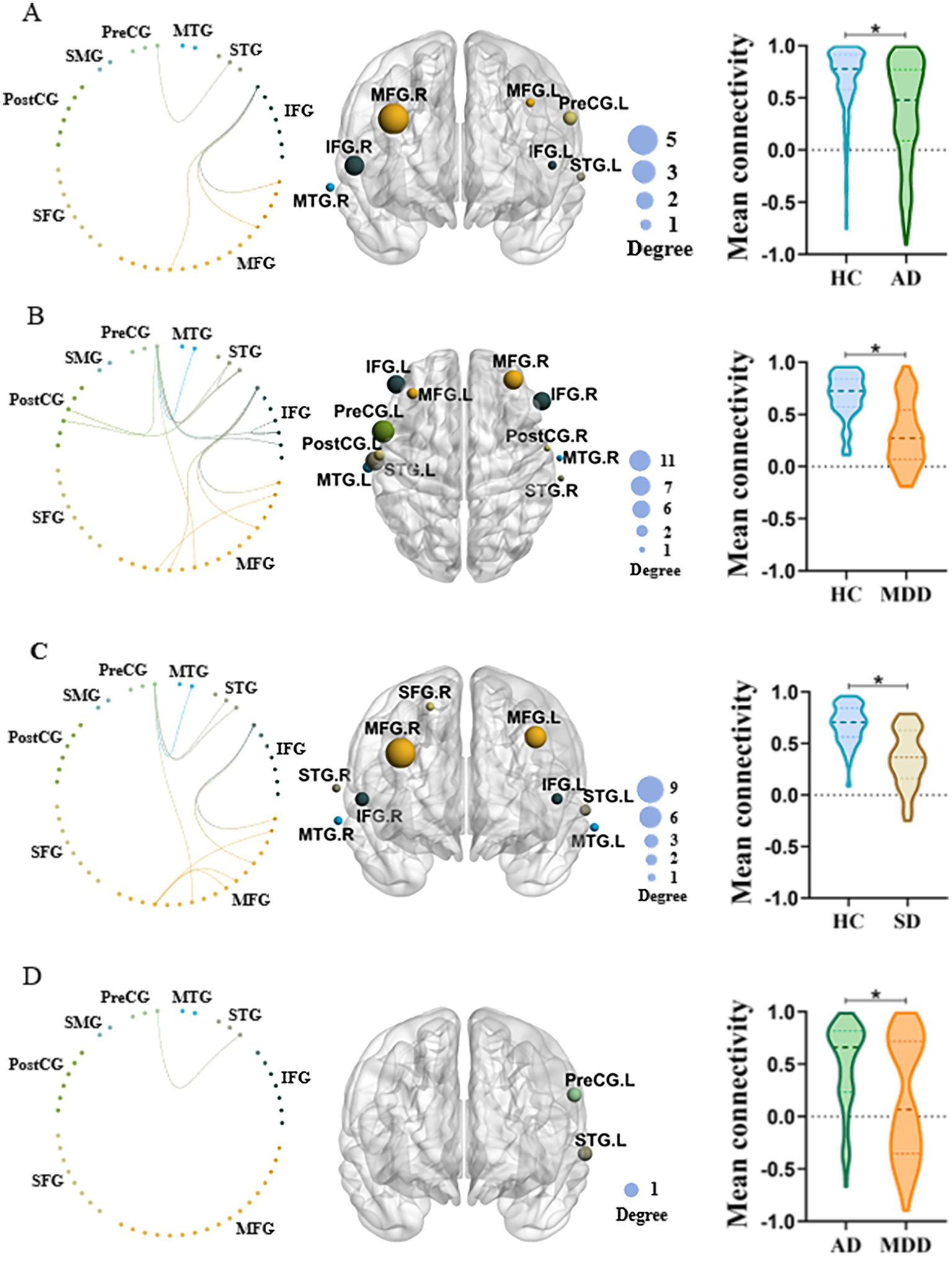 (A) NBS comparison between AD and HC. Left panel: Significantly different functional connectivity network between two groups. Middle panel: The most involved regions in the significant network. Right panel: Mean functional connectivity of the significant network in two groups. The size of the node on the middle panel indicates the number of connections. (B) Similar to A but the comparison between MDD and HC. (C) Similar to A but the comparison between SD and HC. (D) Similar to A but the comparison between MDD and AD.