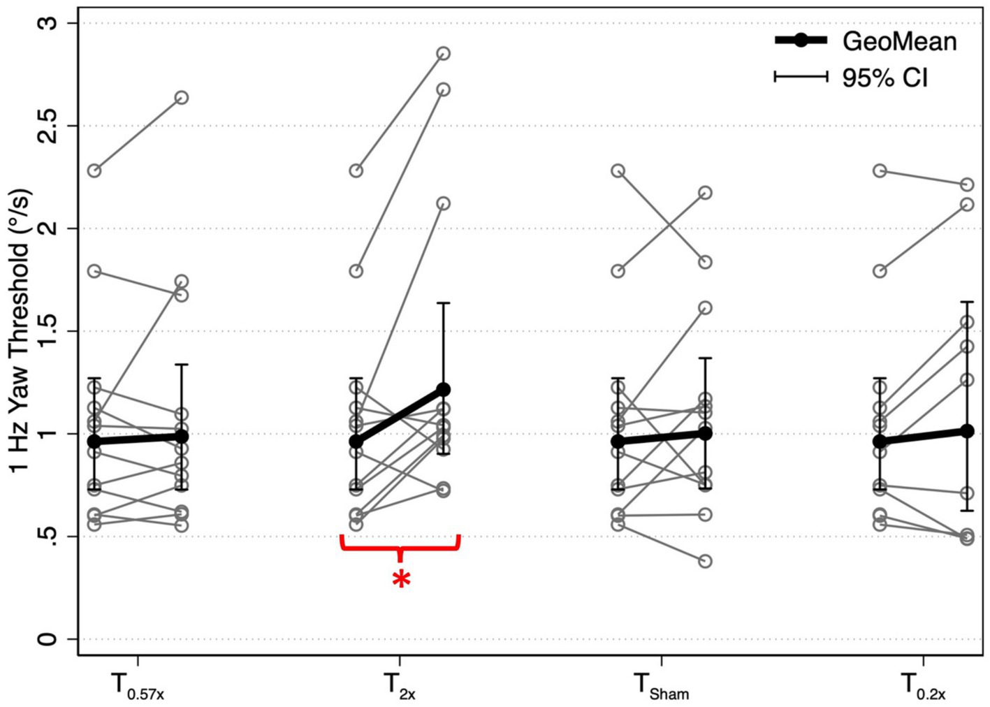 1 Hz yaw rotation perceptual thresholds are shown for each post-conditioning block relative to baseline yaw perceptual thresholds. Solid black lines show the geometric mean of yaw rotation thresholds, with error bars representing the 95% confidence intervals. Geometric means (GeoMean) are shown secondary to the log normal distribution of perceptual thresholds. All statistical analyses were performed on untransformed data and the results were unchanged when repeated after log transformation. T0.57x, 57.4% of yaw threshold; T2x, 200% of yaw threshold; TSham, 1 mm/s peak velocity 1 Hz interaural translations; T0.2x, 20% of yaw threshold. The T0.2x condition was completed by 9 of the 12 participants. * indicates a significant difference from baseline (p < 0.05).