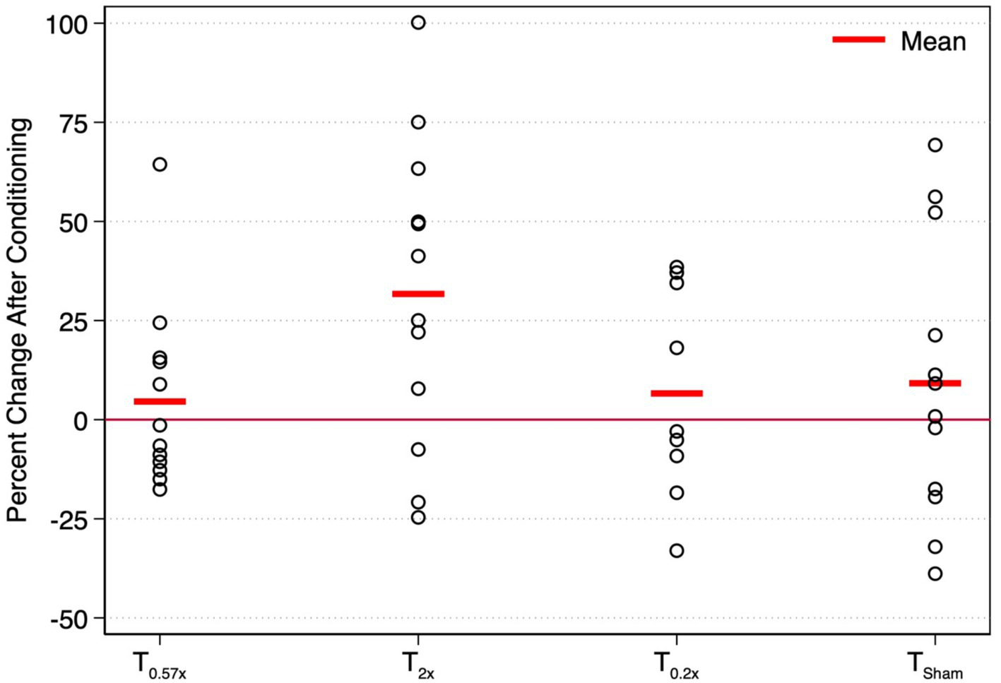 The percent change in yaw rotation thresholds after each conditioning task is shown for each of the 12 healthy control participants. Mean changes in thresholds across participants are indicated by horizontal red bars. T0.57x, 57.4% of threshold; T2x, 200% of threshold; TSham, 1 mm/s peak velocity 1 Hz interaural translations; T0.2x, 20% of threshold.