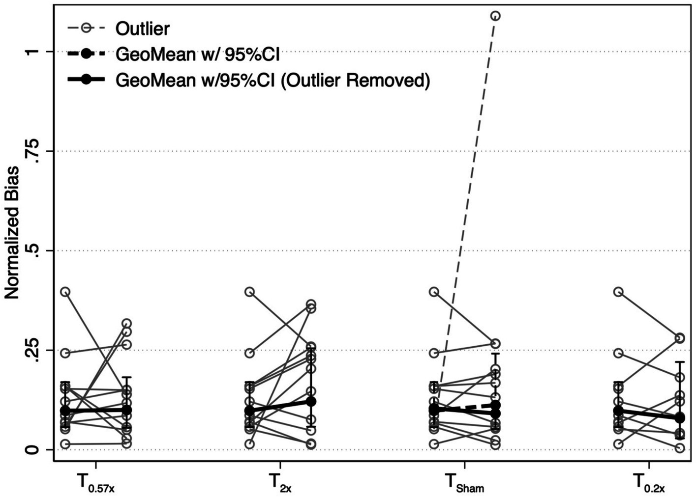 Changes in the absolute value of the normalized bias parameter are shown for each conditioning task. Solid black lines show the geometric mean of the bias, with error bars representing the 95% confidence interval. One participant showed an exaggerated bias after the TSham condition (narrow dashed line). Results with this participant included (wide dashed line) and removed (wide solid line) are shown. Removal of this individual did not change our findings. T0.57x, 57.4% of threshold; T2x, 200% of threshold; TSham, 1 mm/s peak velocity 1 Hz interaural translations; T0.2x, 20% of threshold.