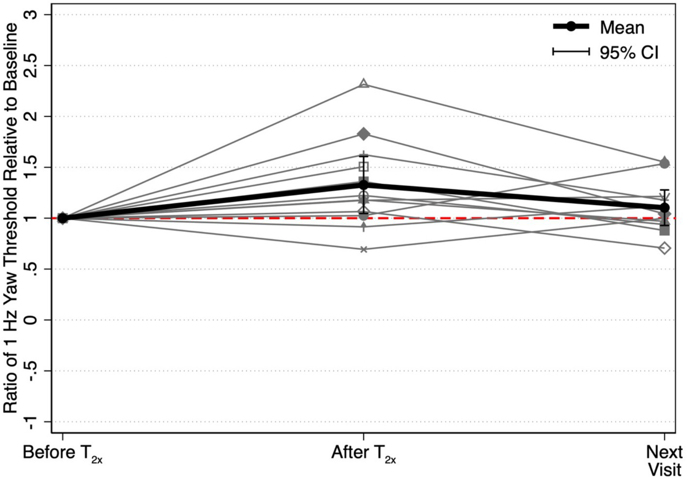 Ratios between each threshold and the baseline threshold captured prior to the T2x conditioning stimulus (“Before T2x”) are shown to depict the relative to change in yaw rotation thresholds at each of two time points, immediately following conditioning (“After T2x”) and at the next visit to the laboratory (“Next Visit”) (i.e., 1.0 = equivalent to T2x baseline). Mean threshold ratios and the corresponding 95% confidence intervals are shown at each time point. Yaw rotation thresholds were estimated from a single block of 150 trials.