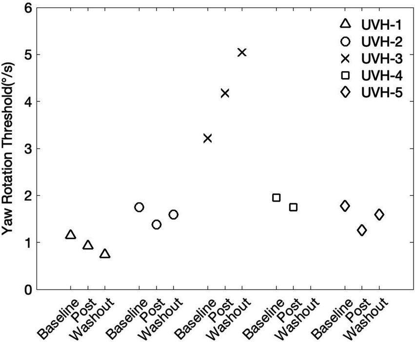 In 4 of the 5 participants, a 2nd follow-up threshold assessment was able to be captured after a 30-min washout period. In two of the individuals who showed an immediate reduction in thresholds, yaw rotation thresholds increased back toward baseline (UVH-2 and UVH-5, Figure 6). In one individual, thresholds were further lowered away from baseline (UVH-1), and in the one participant with elevated thresholds after conditioning (UVH-3), thresholds continued to increase after the washout period (Figure 6). In the individual with elevated thresholds, the changes were transient. The yaw rotation threshold estimated from the initial block of 100 trials (2.72 deg/s) performed prior to T0.57x conditioning was similar to thresholds estimated from an additional 200 trials captured approximately 1 month later (2.51 deg/s).