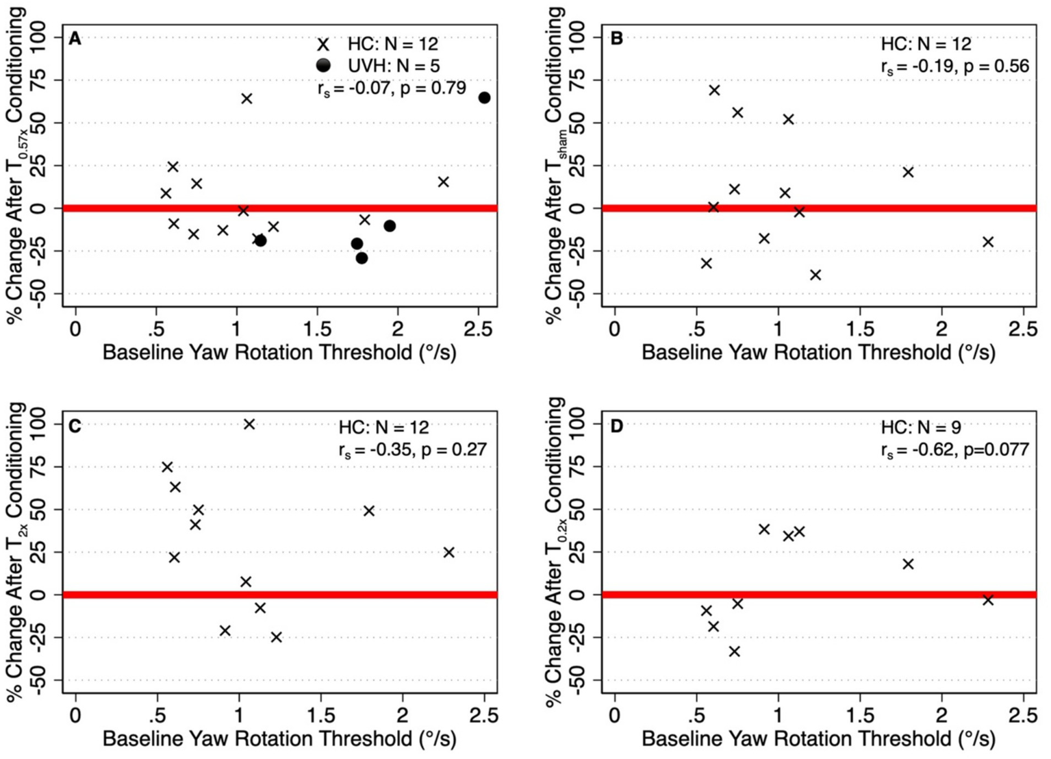 (A) Relationship between the percent change in thresholds after T0.57x conditioning and baseline thresholds in both the healthy control cohort (HC, N = 12, x) and unilateral vestibular hypofunction (UVH, N = 5, ⚫) cohorts. (B–D) Show the correlations between baseline thresholds and the change in thresholds after the Tsham T2x, and T0.2x conditions, respectively, in the HC cohort. Red lines placed at y = 0 are shown to differentiate between participants whose thresholds were increased (i.e., percent change greater than 0) and decreased (percent change less than 0) relative to baseline.