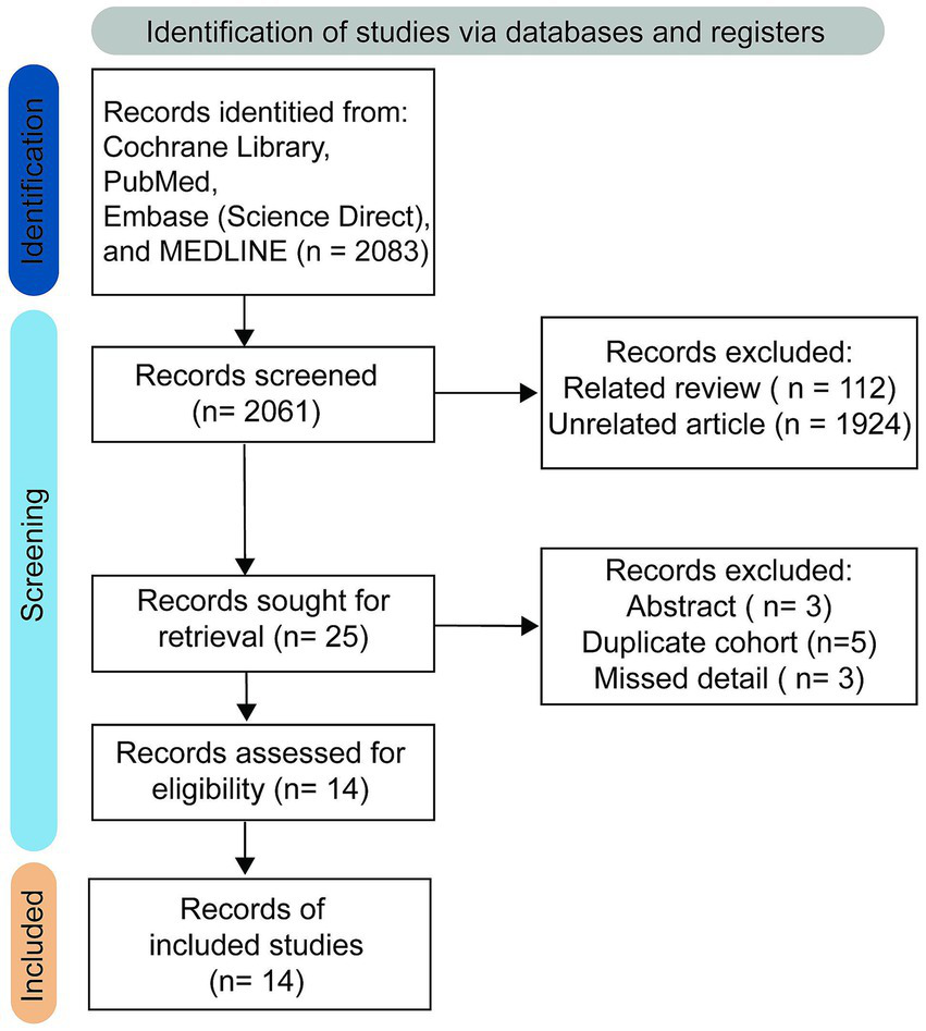 No restrictions were imposed on study type to maximize the number of studies retrieved. The initial literature search retrieved 2061 studies, of which 112 were identified as relevant reviews, while 1924 were classified as unrelated research papers and were excluded after thorough evaluation. The online database search strategy subsequently identified 25 results, with 14 remaining after excluding 3 abstracts, 5 duplicate cohorts, and 3 studies that lacked essential information. Ultimately, therefore, 14 studies comprising 886 patients fulfilled the inclusion criteria and were included in the qualitative analysis (25, 26, 34–45). A PRISMA flow-diagram illustrating the screening process is presented in Figure 2. Patient characteristics, detailed imaging device parameters, and post-processing approaches are summarized in Tables 2, 3.