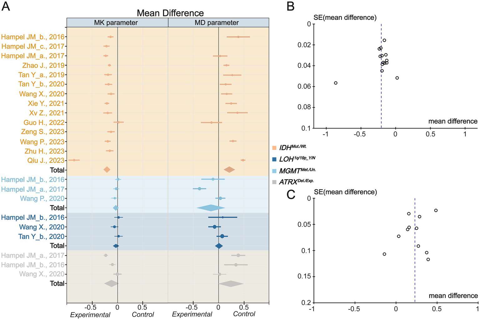 Fourteen studies comprising 886 patients were included in this meta-analysis. Regarding MK and MD, the mean difference between isocitrate dehydrogenase (IDH) mutation and IDH wild type was −0.21 (95% confidence interval [CI] −0.27 to −0.15; I2 = 93%) and 0.22 (95% CI 0.11 to 0.33; I2 = 92%), respectively. This heterogeneity could be explained by imaging parameters such as repetition time, echo time, maximal b-value, and number of diffusion directions. However, the mean difference did not reflect the genetic status of 1p/19q, α-thalassemia/mental retardation syndrome-X-linked (ATRX) gene, or O6-methylguanine-DNA-methyltransferase (MGMT). Analysis of diagnostic accuracy revealed that the pooled areas under the curve for MK and MD, based on IDH status, were 0.96 (95% CI 0.93 to 0.97) and 0.76 (95% CI 0.71 to 0.81), respectively. Heterogeneity was not observed for these DKI parameters.
