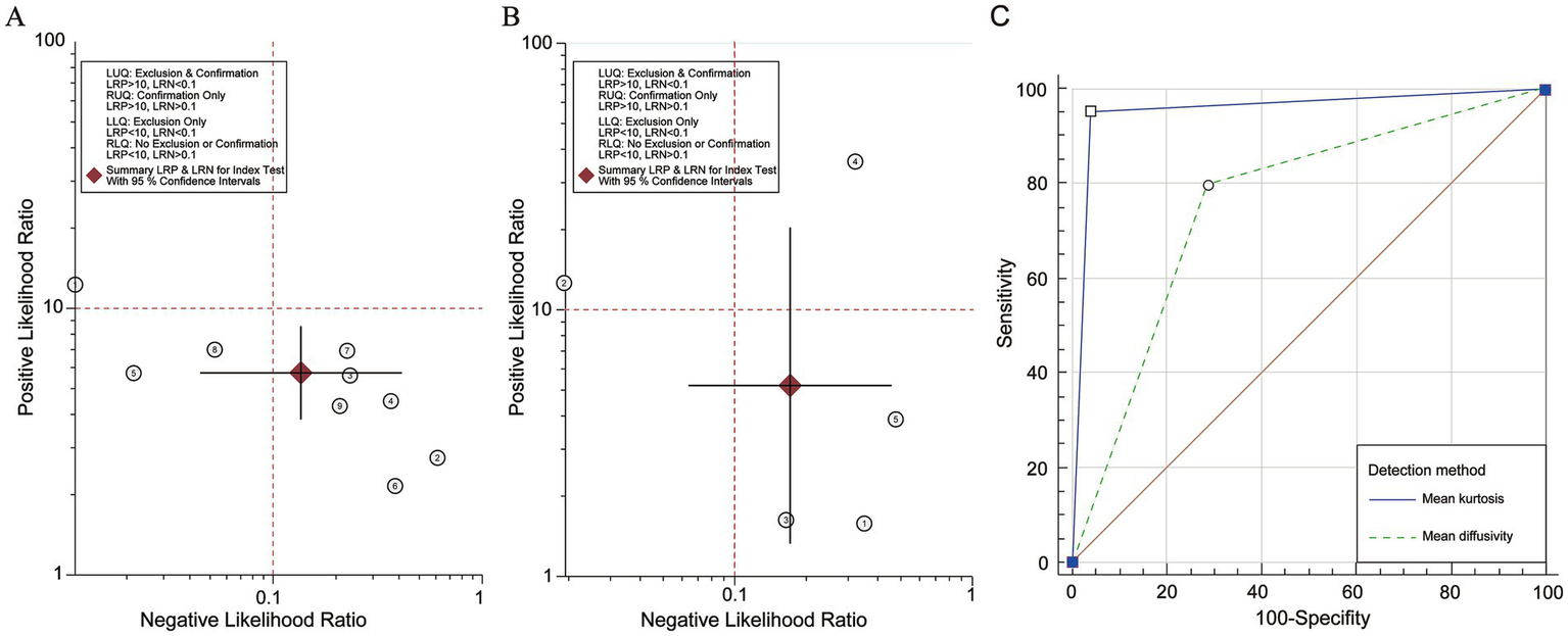 Mean differences in MK and MD were summarized to analyze variations across various glioma genotypes through inverse variance meta-analysis using an appropriate model. If preliminary heterogeneity was assessed as low or moderate (I2 ≤ 50%), a fixed effects model was applied; conversely, if heterogeneity was high (I2 > 50%), a random effects model was adopted (30). To explore sources of heterogeneity, further subgroup analyses based on patient characteristics, imaging vendors, and pre-processing parameters were performed. The results of the τ2 statistic and χ2 test were examined to evaluate variance between studies. The I2 statistic was also utilized to assess heterogeneity in the subgroup analyses. To estimate the diagnostic accuracy of DKI for glioma genotypes, a bivariate random effects meta-analysis with a restricted maximum likelihood estimation method was used. A likelihood ratio scattergram was used to assess model fit effects. Publication bias was examined using a funnel plot and the Deek’s test. A Fagan nomogram was used to indicate post-test probabilities based on varying pre-test probabilities for clinical decision making. Forest plots of diagnostic scores, odds ratio, positive diagnostic likelihood ratio (PLR), and negative diagnostic likelihood ratio (NLR) were used to quantify the diagnostic effect. Statistical analyses were performed using Stata 17.0 Software, Revman 5.4 and MedCalc.1,2,3 MedCalc was a comprehensive statistical analysis software widely used in various medical studies, specifically for receiver operating characteristic (ROC) curve analysis (31). Compared with Stata and Review Manager, MedCalc can control for the influence of heterogeneity within different studies and the limitations of small experimental populations. The effects of heterogeneity were minimized to obtained more accurate results based on DeLong and Binomial exact methods by manually inputting data from each study. Differences with p < 0.05 were considered to be statistically significant (32, 33).
