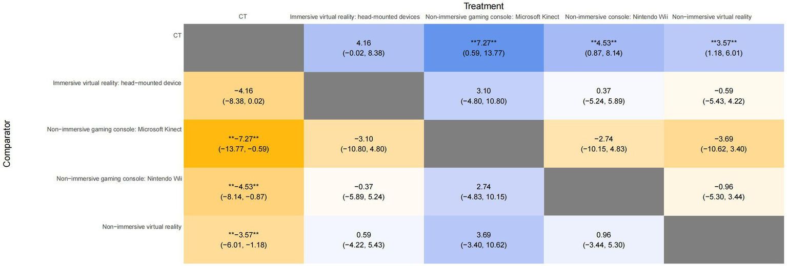The network diagram is displayed in Figure 3. Six studies (39, 41–44, 55) compared head-mounted devices to CT, while 16 studies compared NIVR systems to CT (38, 49–53, 56, 59–67). A total of 12 studies utilized non-immersive gaming consoles; four (34, 37, 45, 46) compared Microsoft Kinect to CT, and eight (35, 36, 40, 47, 48, 54, 57, 58) compared Nintendo Wii to CT. Among these interventions, CT had the largest sample size (759 participants), followed by NIVR (613 participants), Nintendo Wii (151 participants), head-mounted devices (114 participants), and Microsoft Kinect (67 participants).