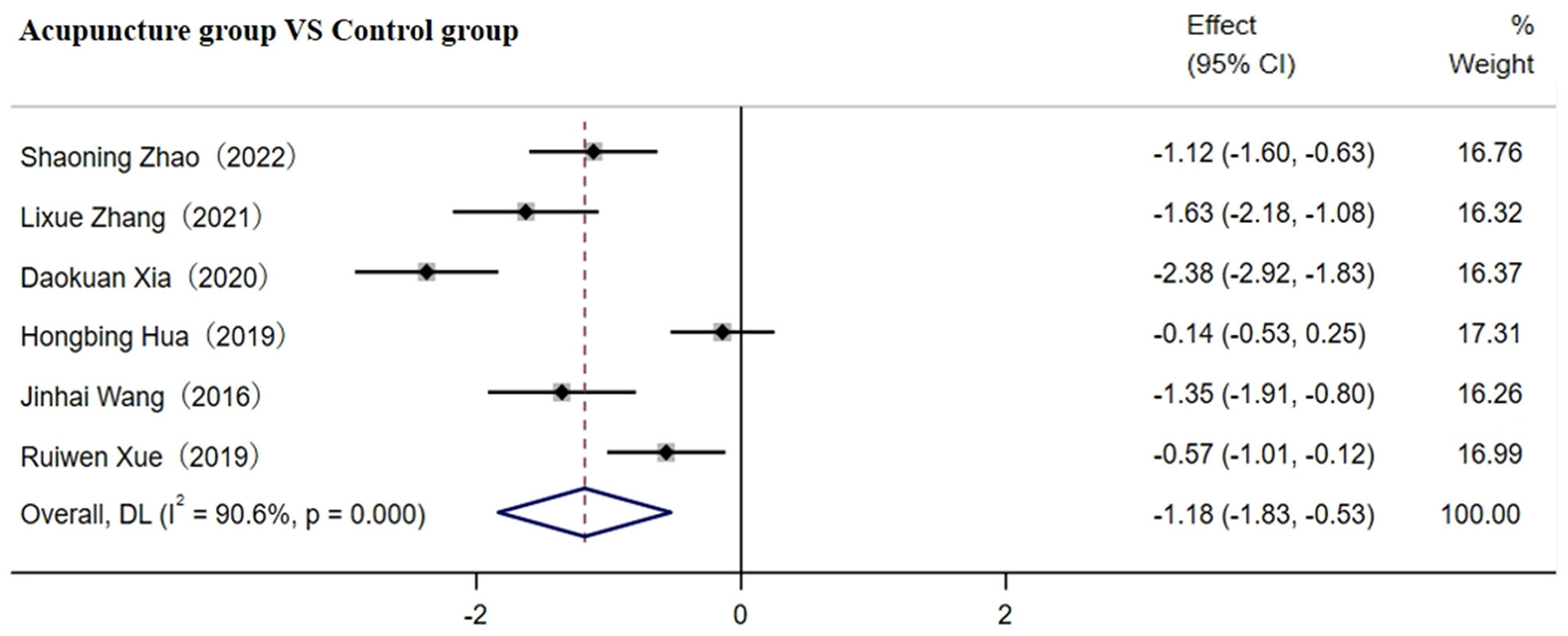 | Li et al. (58) | Random, toss a coin | g | 6.03 ± 1.21h | 5.94 ± 1.27h | 130 | 130 | 62.72 ± 5.84 | 62.82 ± 5.75 | CWT | CWT+acupuncture | 1 time/d | 30 min | 14 | ①II②II⑥⑦ |