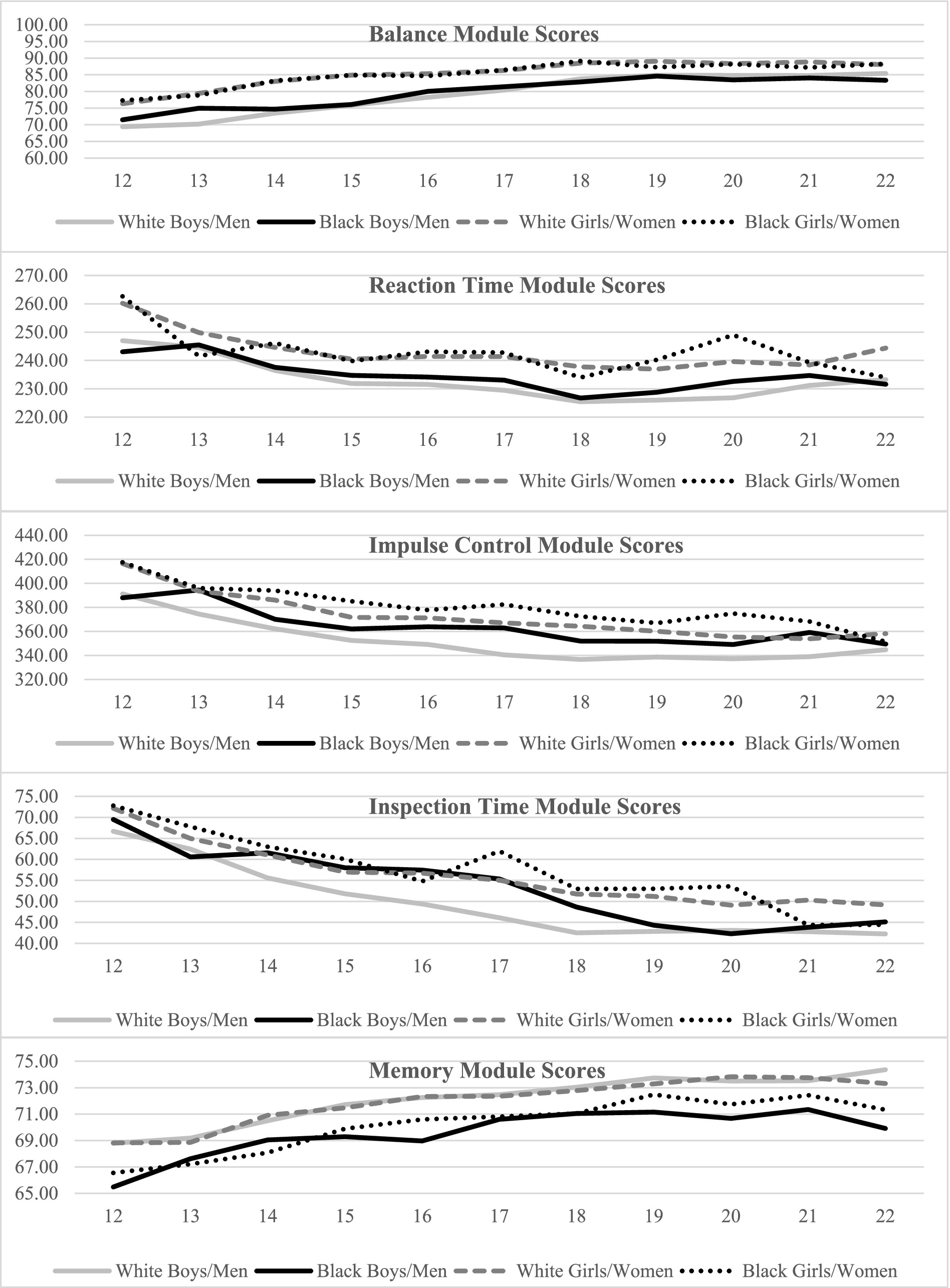 Results: The race-associated differences (effect sizes) between Black and White athletes ranged from extremely small (negligible) to small across all ages for both sexes on Balance, Reaction Time, Inspection Time, and Impulse Control scores. For the Memory Module, the effect sizes ranged from small to medium across all ages for both sexes. White boys/men had higher Memory scores than Black boys/men (Hedges’ g = −0.18 to −0.60). White girls/women had higher Memory scores than Black girls/women (g = −0.13 to −0.39).