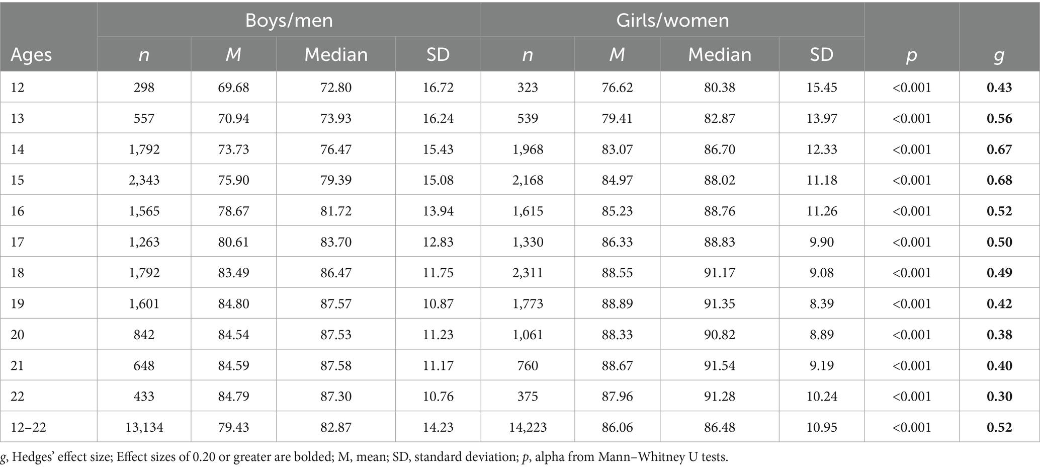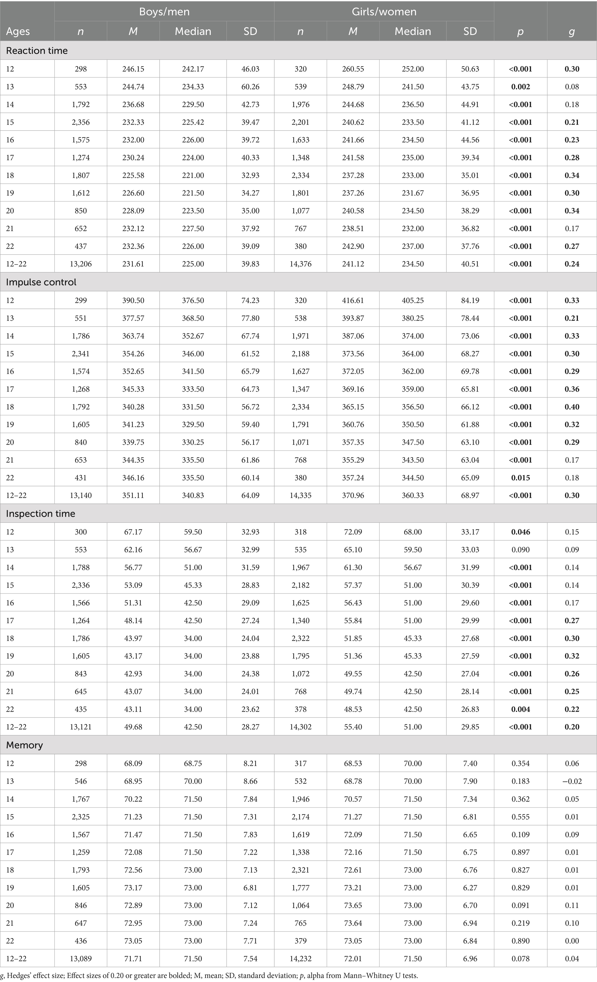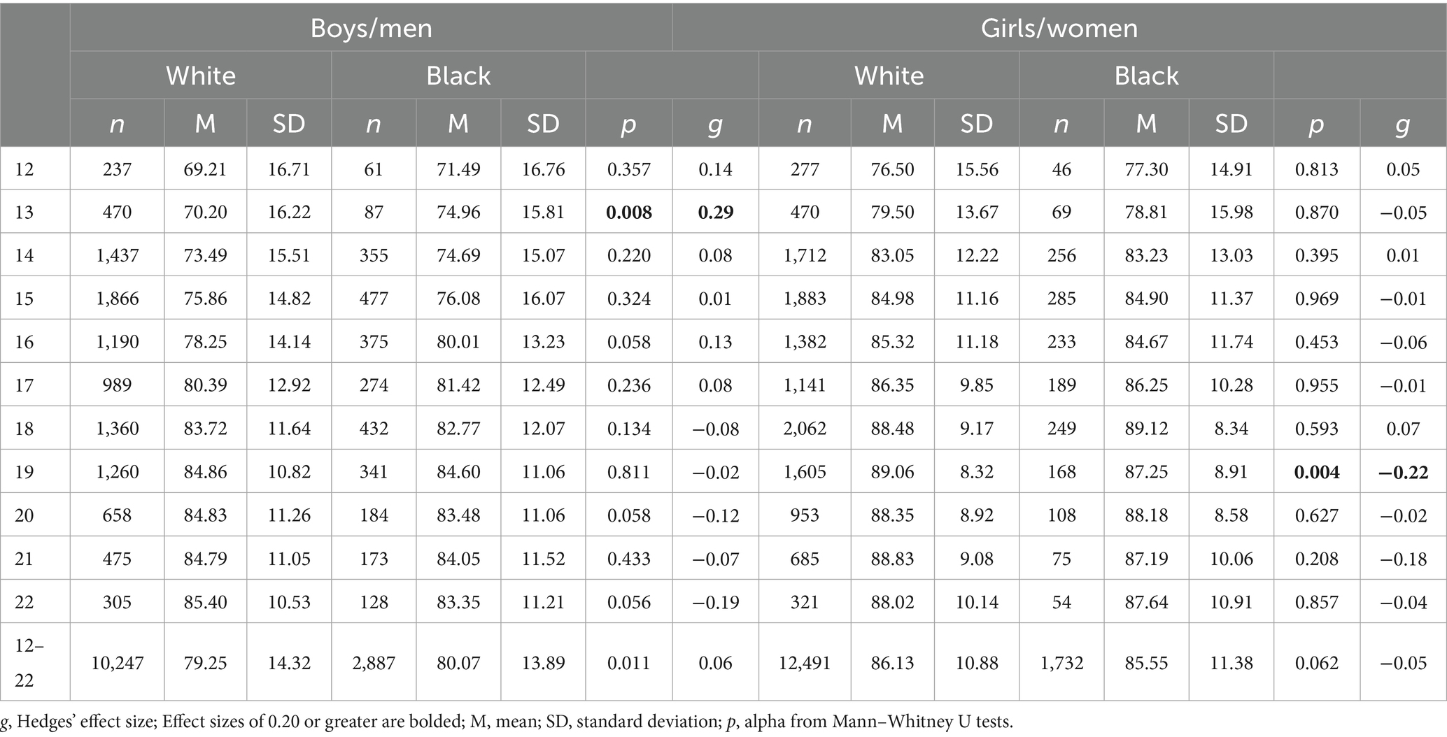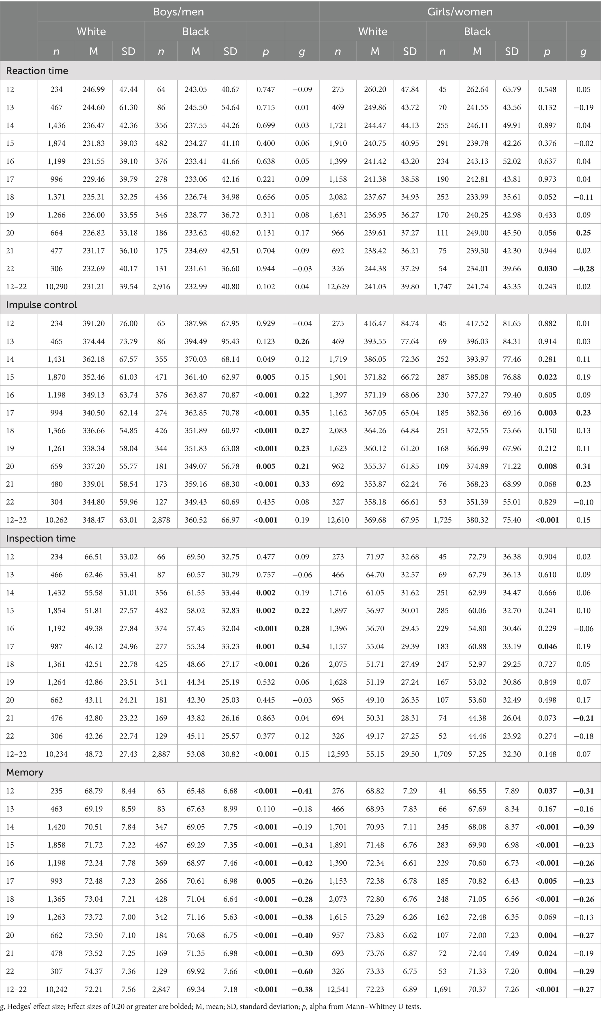 Race-associated differences in cognitive module scores were assessed using Mann–Whitney U tests to compare individuals who self-identified as White and Black within the total sample and then for exploratory purposes they were conducted separately for boys/young men and girls/young women. Hedges’ g effect sizes were interpreted as small = 0.2, medium = 0.5, and large = 0.8 (33). Effect sizes were emphasized in the interpretation of results given that the extremely large sample sizes will result in small differences being identified as statistically significant.