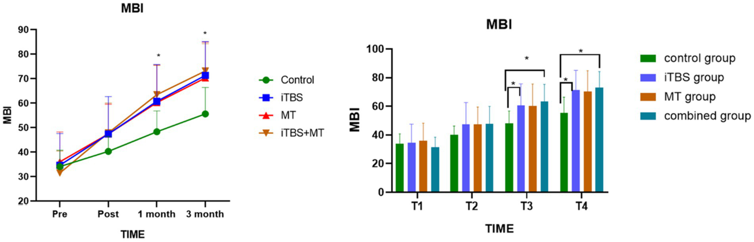 All statistical analyses were performed using the Statistical Package for Social Sciences (SPSS), v27.0. Descriptive analysis in SPSS depicted participant characteristics as mean and standard deviation. Changes before and after the two-week intervention were scrutinized for statistical significance through an ANOVA mixed model design, with Time (Baseline, Post, 1 Month, 3 Months) as a within-subject factor and Group (Basic, MT, iTBS, combined MT and iTBS) as a between-subject factor, encompassing FMS, NIHSS, BI, SS-QOL, RMT, and MEP. Paired t-tests with correction for multiple comparisons and LSD method were used for post hoc analysis. Normal distribution was verified with the Kolmogorov–Smirnov test prior to ANOVA data input. A significance level of p< 0.05 was employed for all tests.