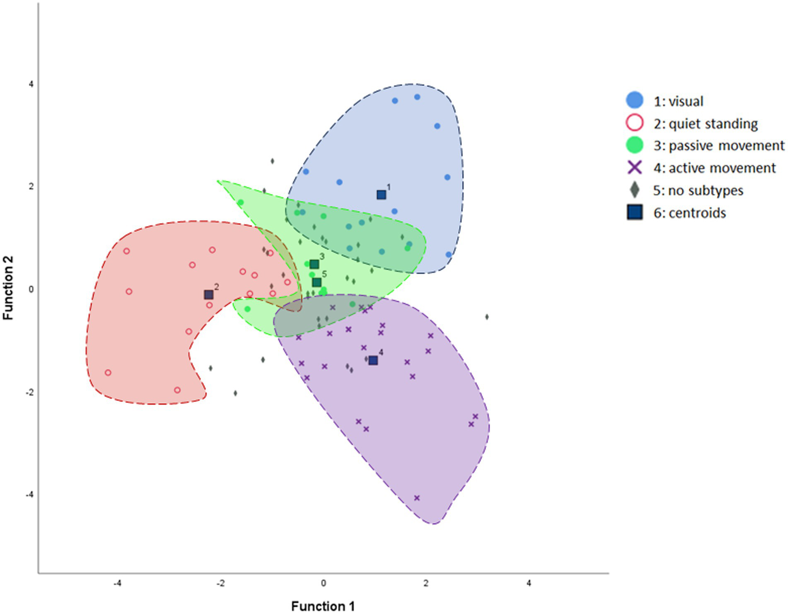 Discriminant analysis demonstrated a clear separation among the different subtypes based on the four question domains (ALQvis, ALQstand, ALQpass, and ALQact), which served as predictors. The analysis yielded significant results (Wilks’ Lambda: χ2 = 181.6, p < 0.001), supporting the existence of the four PPPD subtypes. Table 4 presents the classification function coefficients, and Figure 5 illustrates the canonical discriminant functions. Overall, 77.1% of patients were correctly classified into the predicted subtypes. Specifically, 78.6% were accurately assigned to the ALQvis and ALQstand subtypes, 54.5% were correctly categorized as ALQpass, and 82.6% were accurately included in the ALQact subtype.