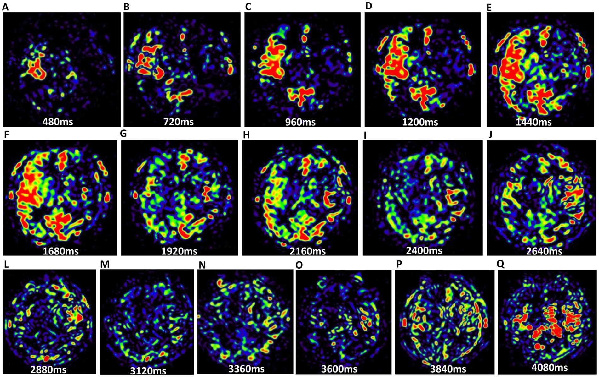 Figure 1. The 16 PWI maps of brain parenchyma from the same slice. (A–Q) Illustrate the progression from the first phase to the 16th phase. Variations in perfusion signal intensities across these periods indicate differences in cerebral blood flow states.