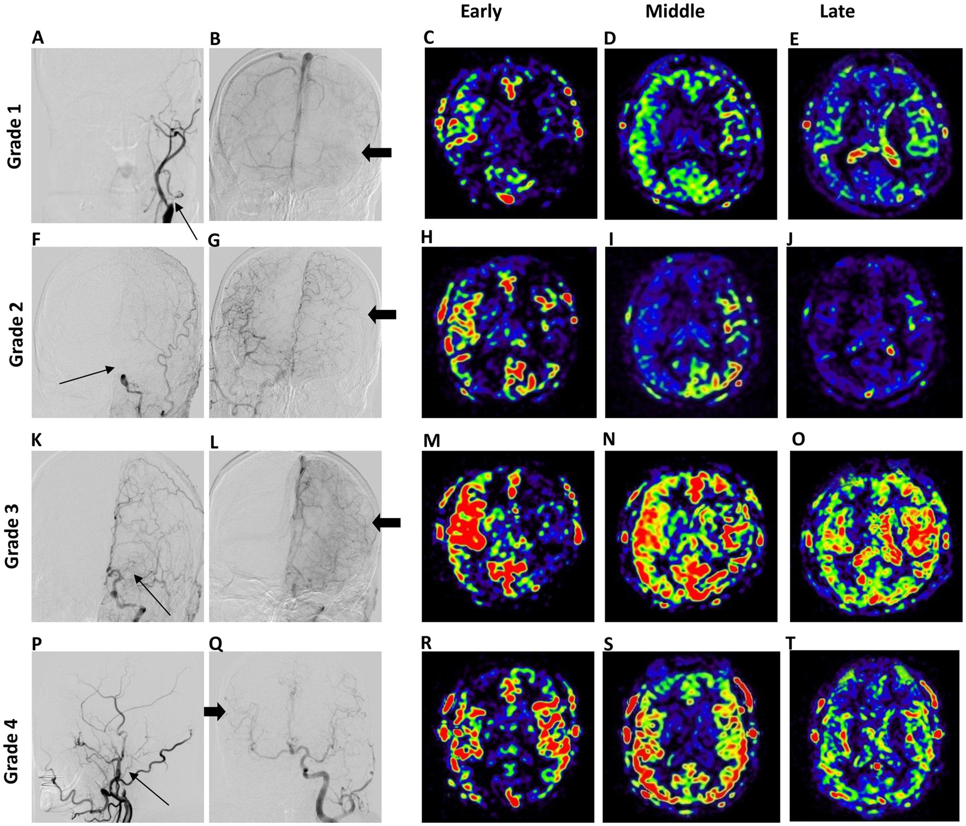 Figure 4. Typical cases of DSA-based (left panel) and collateral flow map-based (right panel) collateral grades. In Grade 1, the anterior DSA reveals left ICA occlusion (thin arrow) and inadequate collateral compensation during the venous phase of right ICA angiography (A,B). The collateral flow map indicates low collateral compensation with a perfusion defect in the left middle cerebral artery (MCA) territory (C,E). In Grade 2, the anterior DSA shows left ICA occlusion (arrow) alongside collateral compensation during the arterial phase of right ICA angiography (thick arrow) (F,G). The collateral flow map demonstrates rapid collateral compensation, although a perfusion defect persists in the left MCA territory (H–J). Grade 3 displays anterior DSA indicating left MCA occlusion with collateral flow from the anterior cerebral artery (thick arrow) during the venous phase (K,L). The collateral flow map shows slow but complete compensatory perfusion in the left MCA territory (M–O). In Grade 4, lateral DSA of the right carotid artery reveals right ICA occlusion (arrow) with collateral flow from left to right through the Circle of Willis during the arterial phase (P,Q). The collateral flow map shows both rapid and complete collateral compensation in the right MCA territory (R–T).