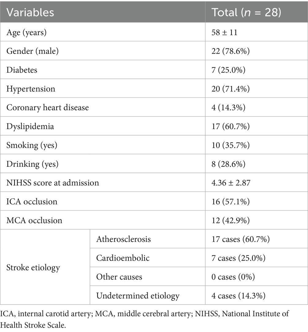 The flowchart of participant enrollment is presented in Figure 3. After screening using the inclusion and exclusion criteria, 28 patients were included in this study. The vast majority of patients were excluded due to the absence of DSA or ASL images. The results of the power analysis indicated that the sample size of 28 patients achieved a power of 96.7%, which is higher than the commonly accepted threshold of 90%. Thus, our sample size was sufficient for detecting statistical significance. The clinical data of the 28 patients are listed in Table 1. Among these patients, 16 had ICA occlusions, while 12 presented with MCA occlusions. There were 22 males and 6 females with a mean age of 58 ± 11 years. The primary vascular risk factors included abnormal lipid metabolism (60.7%), hypertension (71.4%), and the admission NIHSS score (4.36 ± 2.87). Additionally, we retrospectively categorized the stroke etiology in our patient cohort. Of the 28 patients evaluated, 17 (60.7%) were likely due to atherosclerosis, 7 (25.0%) were possibly cardioembolic, and 4 (14.3%) had undetermined origins, while no cases were classified under other causes. Notably, the diagnosis of ‘cardioembolic’ and ‘undetermined’ etiology often arose from incomplete evaluations due to patient constraints, such as financial limitations or a misunderstanding of the investigative process.