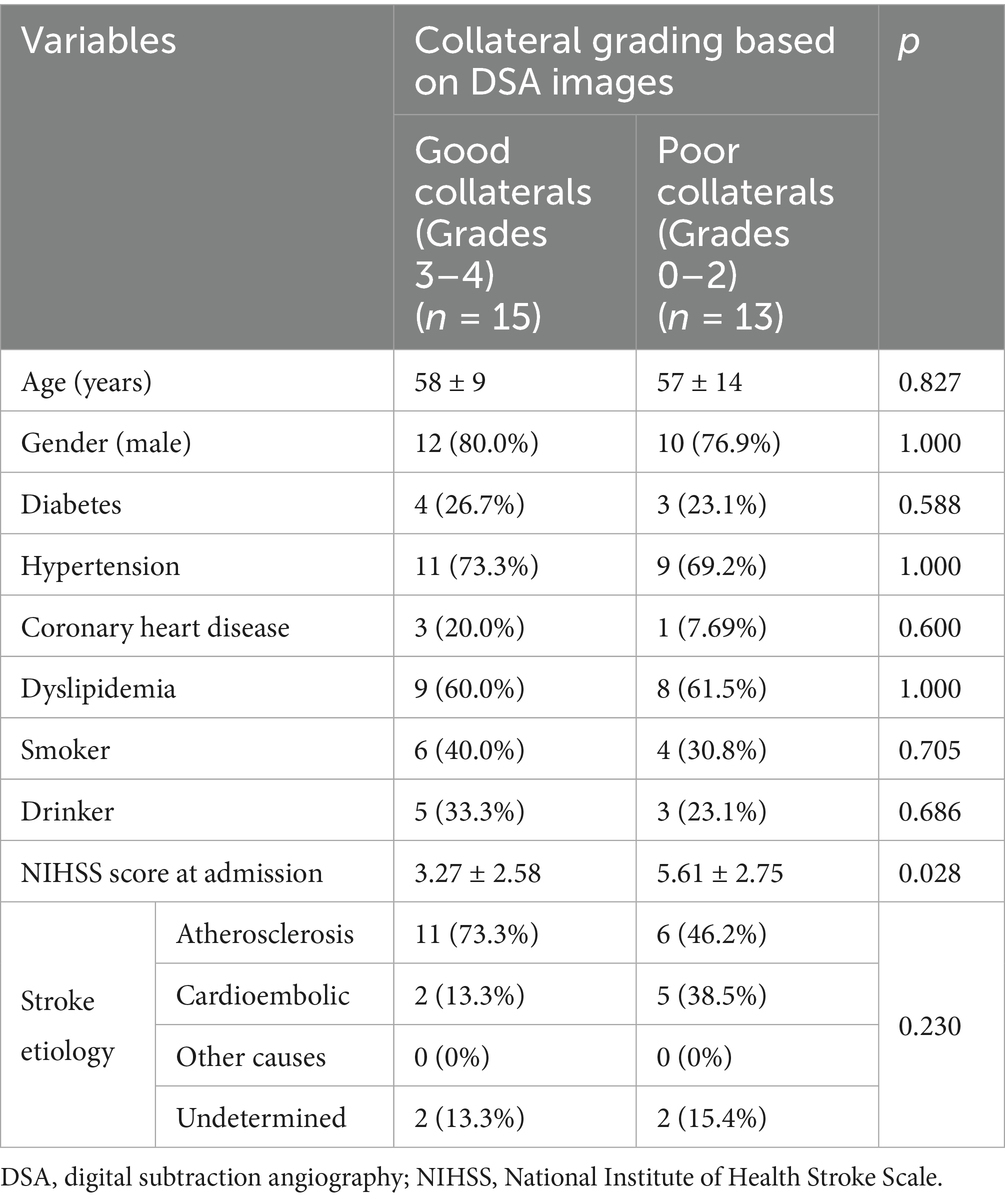 The collateral circulation grading results based on DSA images revealed that the numbers of patients with Grades 0 to 4 were 0, 6, 7, 8, and 7, respectively. The к coefficient for the interobserver agreement was 0.856. There were 13 patients with poor collaterals (Grades 0–2) and 15 patients with good collaterals (Grades 3–4) (Table 2). There were no statistically significant differences in gender, age, and vascular risk factors between poor- and good-collateral groups. The admission NIHSS score of the good collateral group was significantly lower than that of the poor collateral group (p = 0.028) (Table 2).
