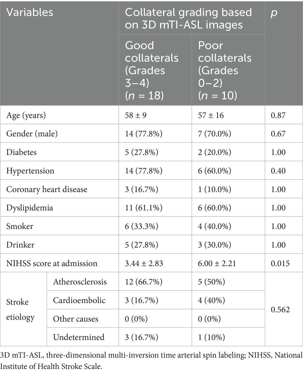 The collateral circulation was also graded based on the mTI-ASL images. The results indicated that there were 0, 7, 3, 11, and 7 patients classified as Grades 0, 1, 2, 3, and 4, respectively. The к coefficient for the interobserver agreement was 0.849. A total of 10 patients were graded with poor circulation (Grades 0–2), and 18 patients with good circulation (Grades 3–4). The admission NIHSS score of the good-collateral group was significantly lower than that of the poor-collateral group (p = 0.015) (Table 3).
