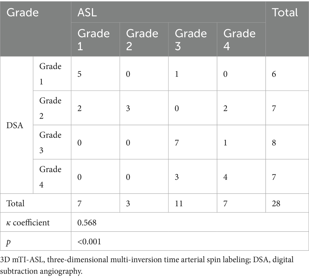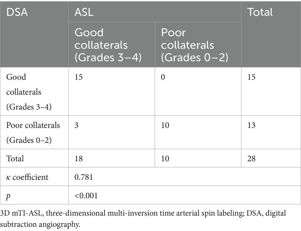 Methods: We analyzed data from 28 patients with unilateral internal carotid artery or middle cerebral artery occlusion who underwent both DSA and 3D mTI-ASL imaging before endovascular treatment. A post-processing pipeline was established to grade collateral flow based on 16 perfusion-weighted images. The agreement between the collateral grades derived from ASL and DSA was evaluated.