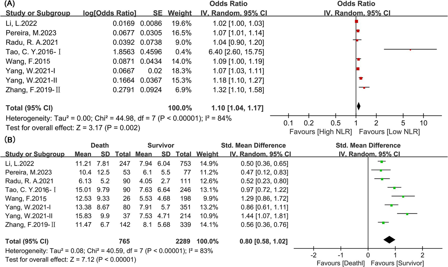 Meta-analysis of 21 studies with a total of 7,176 patients confirmed that NLR has a significant predictive value for mortality (SMD: 0.80, 95% CI: 0.58–1.02; OR: 1.10, 95% CI: 1.04–1.17) and neurological function outcomes (SMD: 0.66, 95% CI: 0.50–0.81; OR: 1.29, 95% CI: 1.17–1.41). NLR also significantly predicted the occurrence of stroke-associated pneumonia (SAP) (SMD: 0.54, 95% CI: 0.21–0.87). Subgroup analysis suggested that NLR had good predictive value for mortality in ICH patients aged ≥60 years, with hematoma volume > 15 mL, and NLR cut-off >7.5, and for neurological function in ICH patients, Asian patients, and those with NLR cut-off >7.5. The stability of the results was confirmed by sensitivity analysis.