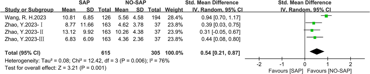 This study included 2 articles (23, 29) with a total of 920 patients for the meta-analysis of SAP occurrence (continuous) variables. The forest plot (Figure 4) showed that NLR levels were significantly higher in patients with SAP than in those without SAP (SMD: 0.54, 95% CI: 0.21–0.87). Egger’s test p = 0.01, and the funnel plot suggested publication bias. The trimming and filling method found that the predictive value of NLR for SAP was not significantly affected by publication bias (SMD: 0.54, 95% CI: 0.21–0.88) (Supplementary Figure 3).