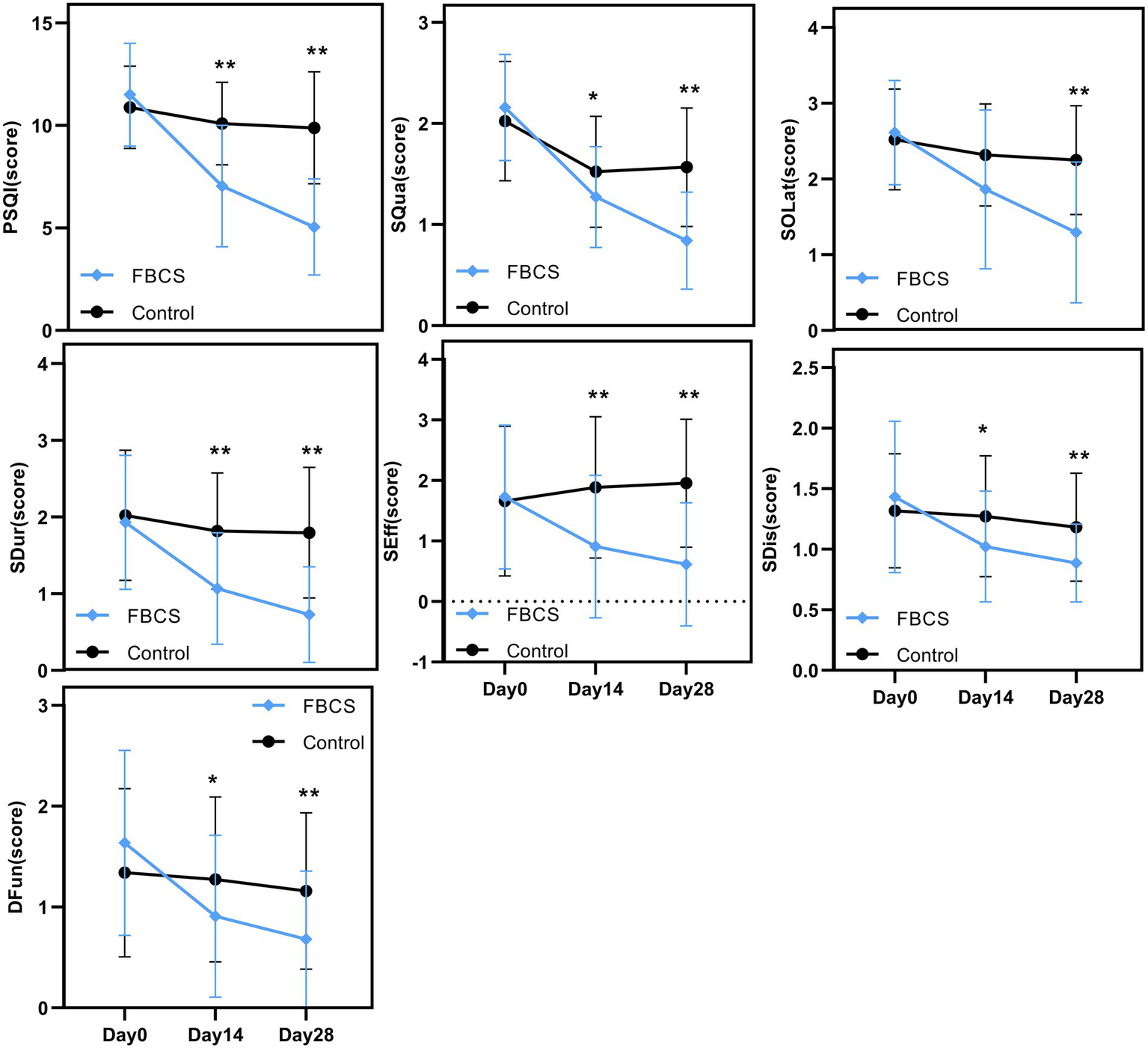 At Day 28, both groups again showed significant reductions in PSQI total score, SQua, SOLat, and SDur compared to baseline (p < 0.01). The FBCS group also demonstrated significant within-group reductions in SEff, DFun, and SDis (p < 0.01), while these three measures remained unchanged in the control group.