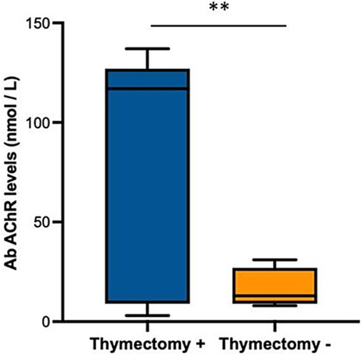 Figure 2. Box plot showing anti-AChR antibody levels, expressed as nmol / L, in patients who underwent (positive, +) or not (negative, −) thymectomy. ** p < 0.01, U-Mann Whitney for indipendent samples.