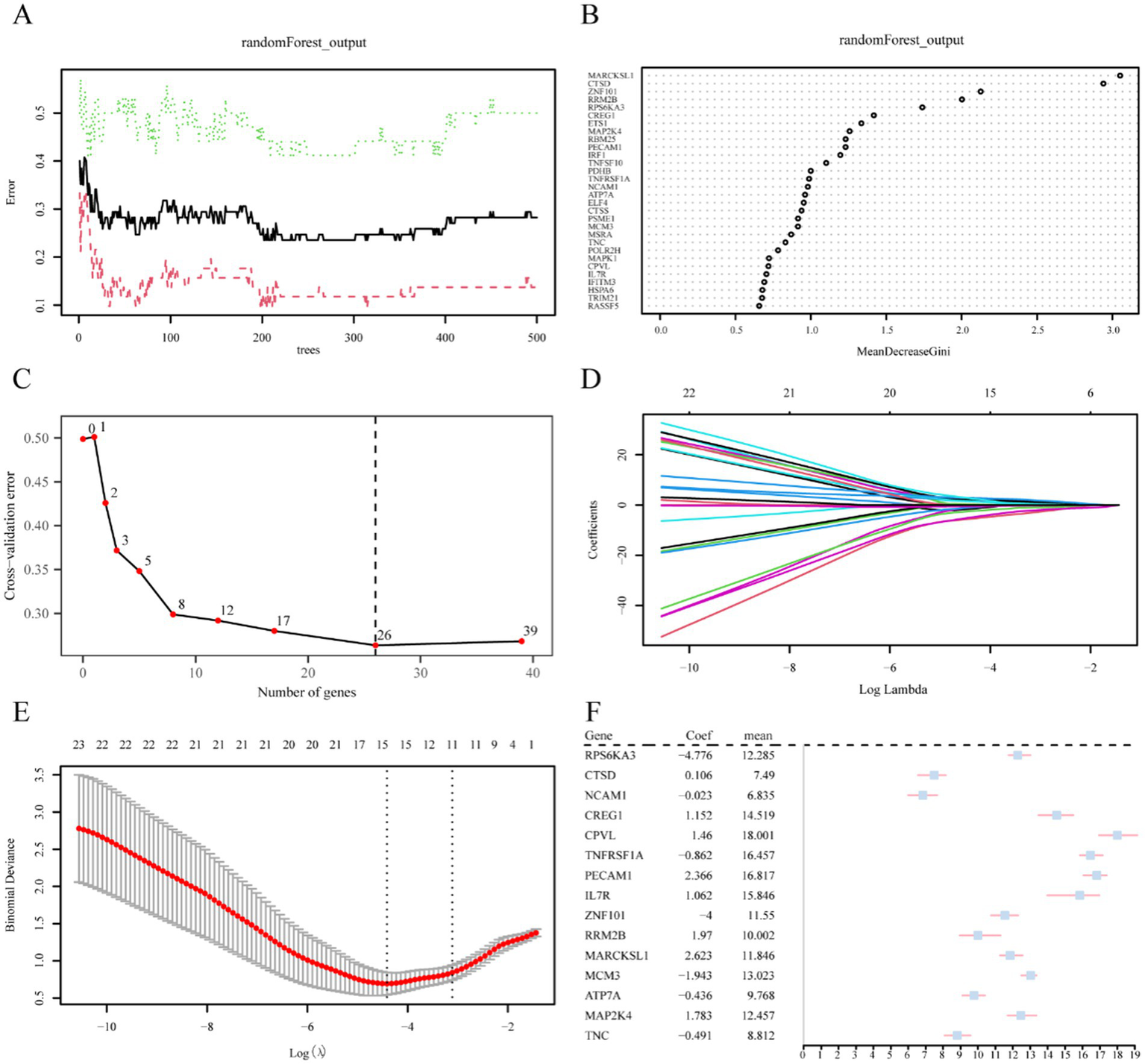 Screening of key genes. (A) Plot of model training error of RF algorithm. (B) MeanDecreaseGini scatter plot of CSRDEGs (in descending MeanDecreaseGini order). (C) Cross-validation error plot. (D) Diagnostic model plot of LASSO regression model. (E) Variable trajectory plot of LASSO regression model. (F) Forest plot of key genes in LASSO regression model. CSRDEGs, cellular senescence-related differentially expressed genes; LASSO, least absolute shrinkage and selection operator.
