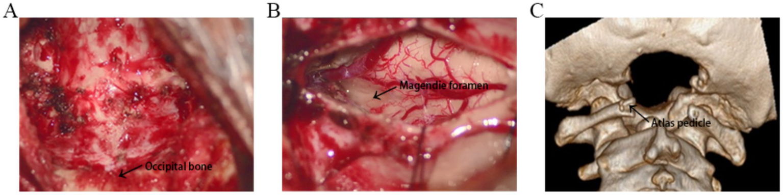 Figure 1. (A) The image shows the 3 cm × 2.5 cm craniectomy and removal of the middle part of the posterior arch of the atlas. (B) The Magendie foramen was fully exposed, and all the factors affecting the outflow of cerebrospinal fluid from the four ventricles were eliminated. (C) Three-dimensional computed tomography reconstruction demonstrates suboccipital craniectomy and removal of the posterior arch of the atlas.