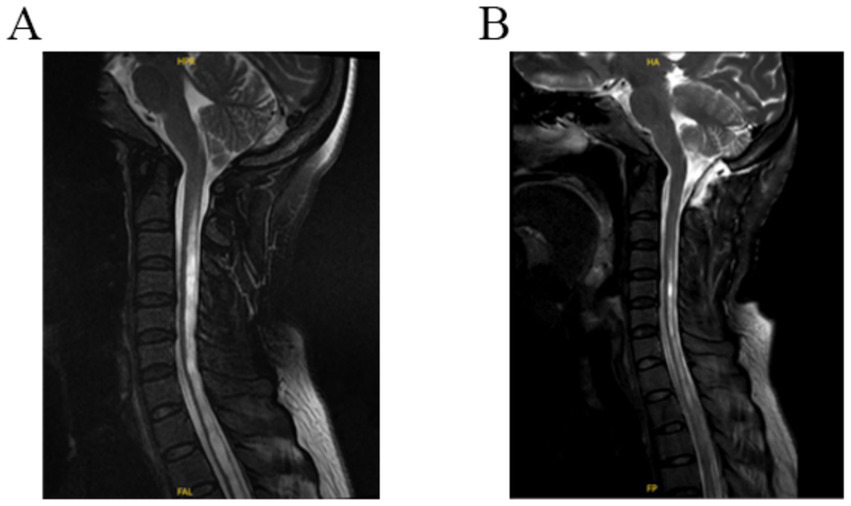 Figure 2. (A) Preoperative T2 MR-weighted images showing cerebellar tonsils through the foramen magnum and syringomyelia. (B) Postoperative T2 MR-weighted 3-day image revealing a decrease in the size of syringomyelia and an enlargement of the subarachnoid space of the foramen magnum.