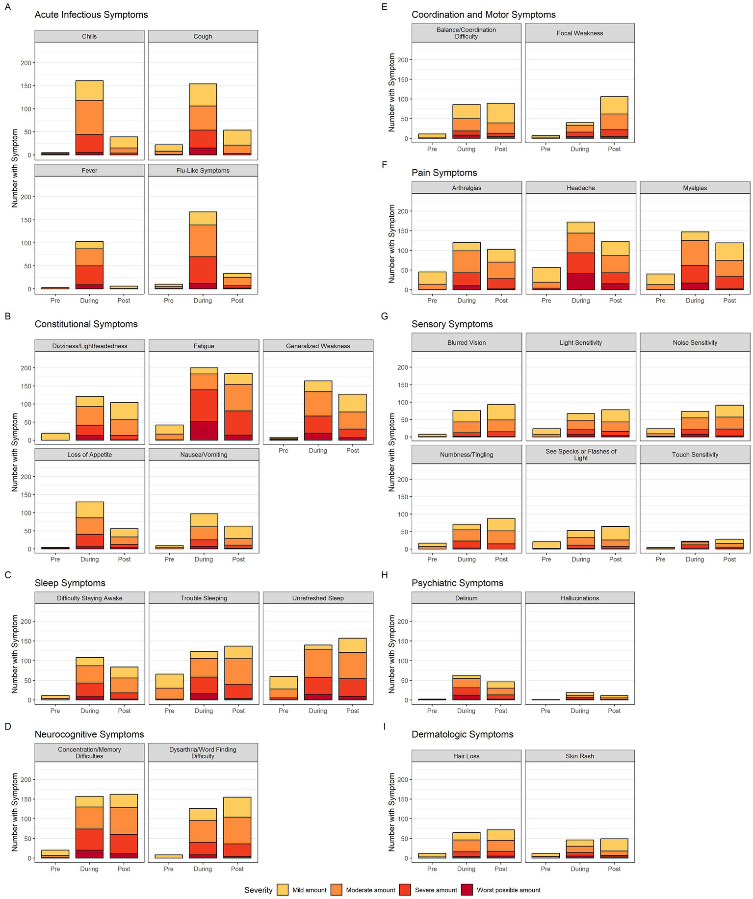 Over 50% reported fever, and over 75% reported “flu-like symptoms,” cough, and chills during COVID-19. Less than 5% reported these symptoms pre and less than 27% post. During COVID-19, fatigue was the most prevalent symptom (95.3%). Other common symptoms during COVID-19 included: headache (82.6%), concentration difficulty/memory difficulties (76.1%), myalgia (70.9%), arthralgia (56.3%), dysarthria/word finding difficulty (60.1%), trouble sleeping (59.2%), difficulty staying awake (53.5%), and dizziness/lightheadedness (59.2%).