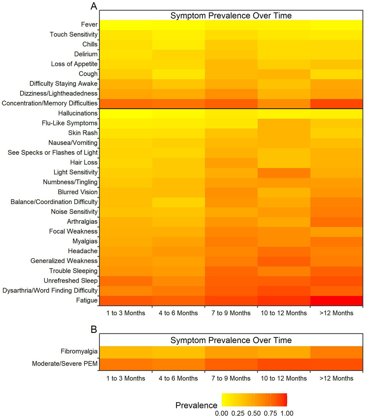 The impact of continuous time from SARS-CoV-2 infection on neurologic symptom prevalence post- COVID-19 was determined using Wilcoxon Rank-Sum tests, to account for any distributional irregularities of the data. For visualization, the prevalence of each neurologic symptom was described across three- month blocks of elapsed time from the onset of acute COVID-19 symptoms, using a heatmap. The symptoms were sorted by mean prevalence overall, from least to most prevalent. Symptoms that were significantly related to continuous time on the aforementioned tests are below the horizontal line, and non-significant are above the horizontal line. To describe the symptom burden trajectory, the number of individuals in the cohort that experienced symptoms of each severity level pre, during, and post COVID-19 were shown using bar graphs. Symptoms were clustered by category of neurologic symptom.