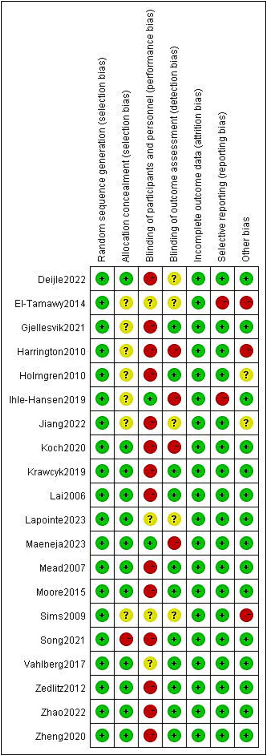 Review Manager 5.4 software (Cochrane) was used to evaluate the quality of the included literature. A case-by-case assessment based on each included study included the following seven main items: (1) Random sequence generation (selection bias); (2) Allocation concealment (selection bias); (3) Blinding of participants and personnel (performance bias); (4) Blinding of outcome assessment (detection bias); (5) Incomplete outcome data (attrition bias); (6) Selective reporting (reporting bias); (7) Other biases; and (8) Other bias. Risk of bias was categorized as āhigh risk of bias (ā)ā āunclear (?)ā āOrā low risk of bias (+).ā