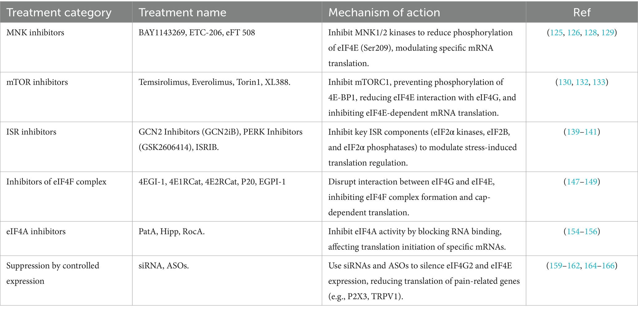 Targeting the eIFs has shown promise in treating a wide range of diseases, particularly in pathological processes associated with aberrant protein synthesis, demonstrating significant efficacy. In the field of pain management, especially in the treatment of neuropathic pain, the strategy of targeting eIFs are gradually emerging as a unique approach with substantial potential. eIFs regulates immunotranslation as well as the translation of neuronal mRNAs, all of which have been implicated in neuropathic pain. Therefore, targeting specific members of the eIFs and related signaling pathways holds promise for inhibiting the aberrant production of pro-inflammatory mediators, modulating neuronal excitability, and alleviating both peripheral and central sensitization of pain. Despite promising preclinical findings, current clinical treatments are not sufficient to fully address neuropathic pain, and extensive research is still underway to identify more effective pharmacological interventions to reduce its impact. We have summarized the current tables relating to treatments targeting eIFs (Table 2).