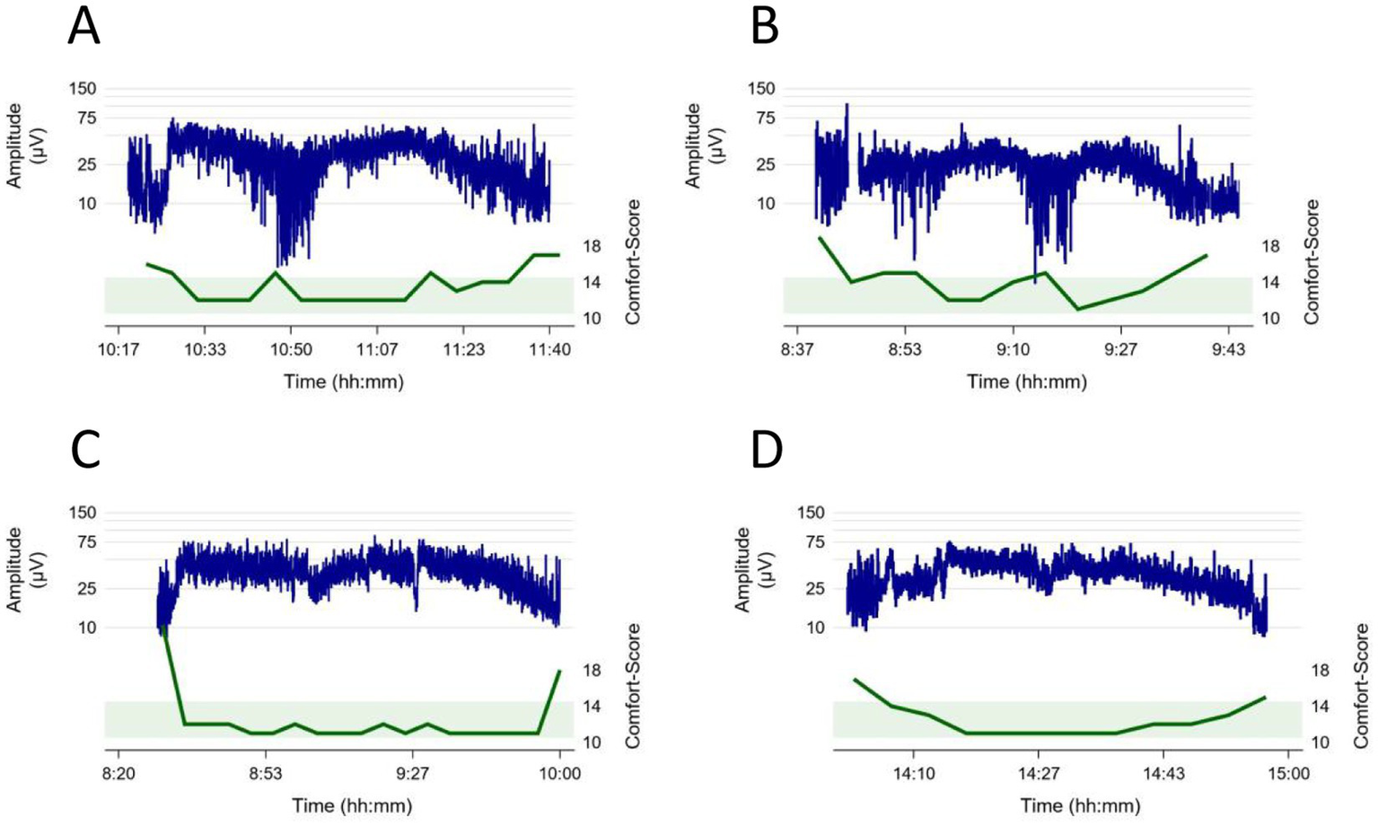 | Regression slope (change of amplitude (μV) per one point increase of comfort score), estimate (95% CI) | −1.4 (−1.5 to −1.2) | −0.9 (−1.4 to −0.3) | −1.3 (−1.6 to −0.9) | −1.7 (−2.1 to −1.3) | −1.3 (−1.6 to −1.1) |