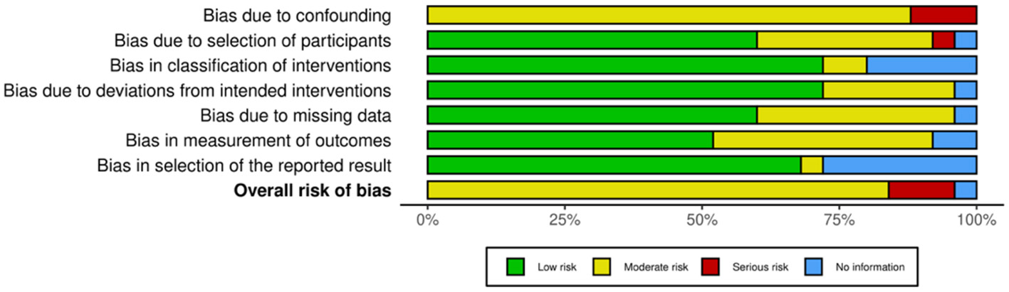 Of the 35 included studies, 10 were RCTs (22, 29–31, 41–46) and 25 were nRCTs (19–21, 23–28, 32–34, 47–59). According to the Cochrane Handbook for Systematic Reviews, the RoB 2 tool was used to assess the RCTs. The bias assessment revealed that four studies had a low overall risk of bias (31, 42, 43, 45), five studies had a moderate risk (22, 30, 41, 46), and one study had a high risk (29). The results for the RCTs are shown in Figures 2, 3. For the nRCTs, the ROBINS-I tool was applied. The assessment showed that 21 studies had a moderate overall risk of bias (19–21, 23, 24, 26–28, 32–34, 47–49, 51, 52, 54, 56–59), three studies had a high risk (50, 53, 55), and one study had insufficient information (25). The results for the nRCTs are presented in Figures 4, 5.