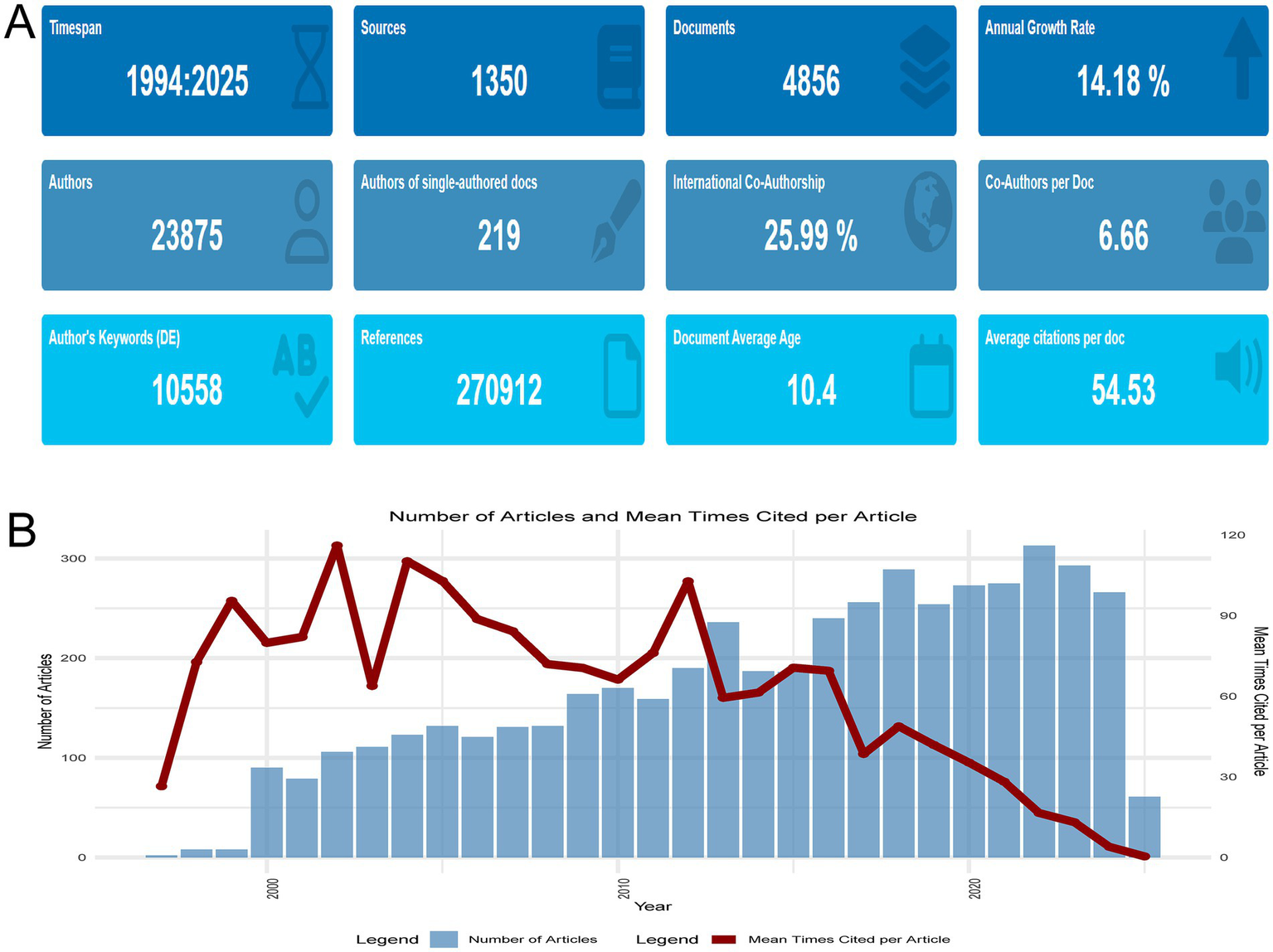 Overall research landscape. (A) Temporal trends in publication output (1994–2025), highlighting a 14.18% annual growth rate, collaborative dynamics (25.99% international co-authorship), and average citations per document (54.53). (B) Annual publication counts and mean citations per article (1997–2025), illustrating fluctuations in citation metrics. Notable peaks in 2002 (mean citations = 116.08) and declines in recent years (2024 = 3.96, 2025 = 0.41) are attributed to citation lag effects, underscoring the dynamic evolution of research impact over time.