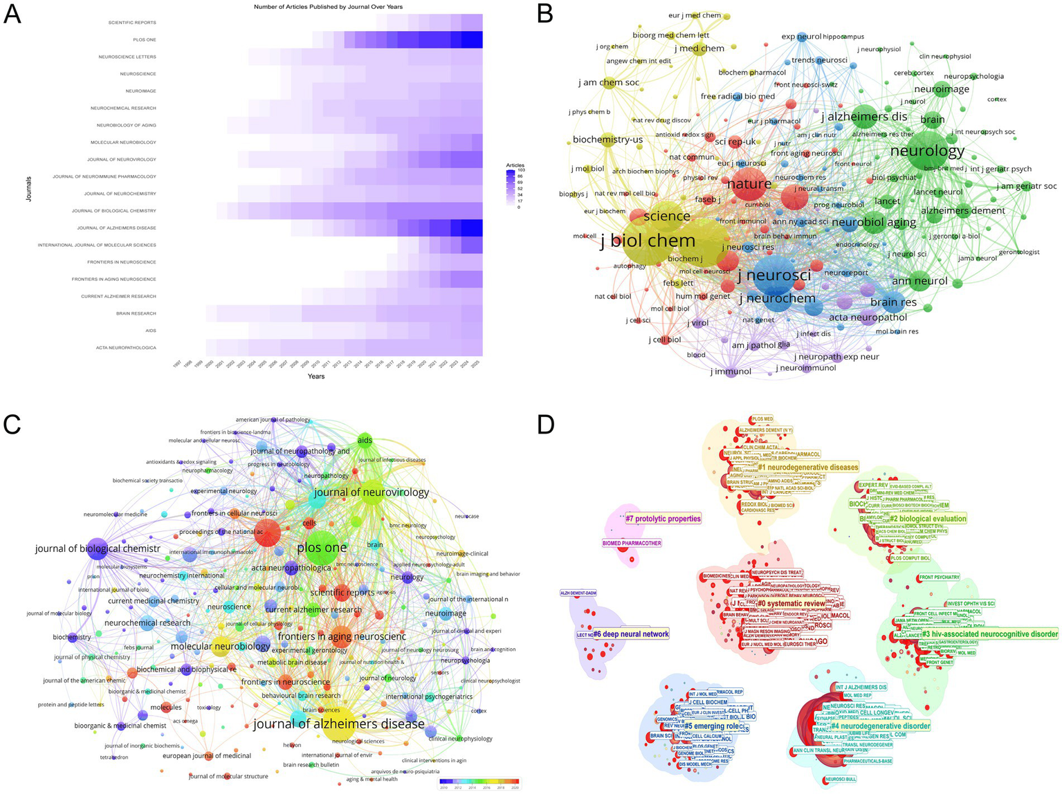 Journal-level analysis. (A) Temporal trends in journal publication output, emphasizing growth in journals such as *PLOS ONE* (102 articles in 2025) and *Journal of Alzheimer’s Disease* (103 articles in 2025). (B) Co-citation network of journals, with node size proportional to citation impact. *Journal of Biological Chemistry* (9,148 citations) and *PNAS* (8,945 citations) emerge as central nodes, underscoring their influence in shaping research discourse. (C) Journal coupling visualization, where node diameter reflects publication volume and color gradient indicates recency. *Journal of Alzheimer’s Disease* and *PLOS ONE* dominate, while journals like *Frontiers in Aging Neuroscience* (57 documents) highlight emerging trends. (D) Eight thematic clusters in HIV-Alzheimer’s research, highlighting key journals: ARCH NEUROL-CHICAGO (Cluster 0), AM J CLIN NUTR (Cluster 1), J AM CHEM SOC (Cluster 2), J IMMUNOL (Cluster 3), J NEUROSCI (Cluster 4), J CELL BIOL (Cluster 5), IEEE ACCESS (Cluster 6), and BIOMED PHARMACOTHER (Cluster 7).