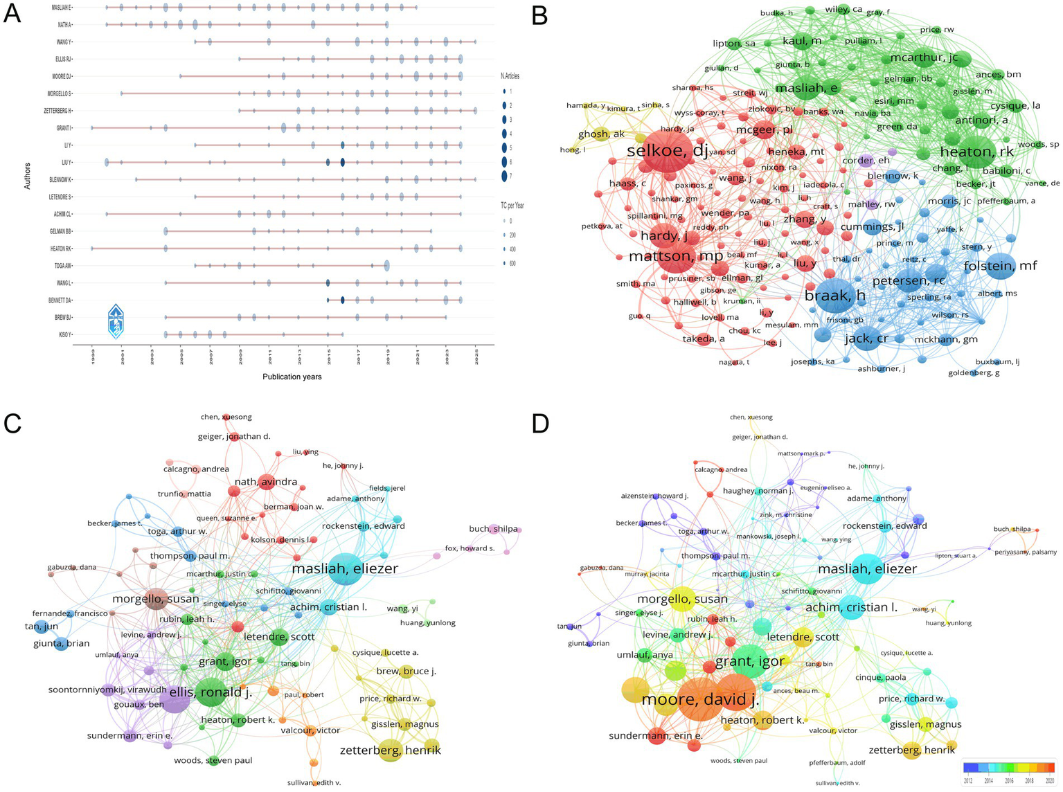 Author-level contributions and networks. (A) Temporal distribution of author productivity, highlighting sustained contributors (e.g., MASLIAH E, NATH A) with consistent annual publications and emerging researchers (e.g., WANG Y) demonstrating post-2015 growth. (B) Co-citation network of authors, with node size reflecting academic influence. Prominent clusters around Selkoe, DJ (509 citations) and Mattson, MP (390 citations) highlight focal areas of research intensity. (C) Co-authorship network map, illustrating collaborative hubs such as Masliah, E (28 documents, 1,396 citations) and Ellis, RJ (25 documents, 363 citations). Line thickness indicates collaborative extent, emphasizing knowledge integration across disciplines. (D) Author influence visualization, ranked by total link strength and recency. Moore, DJ (total link strength = 113) and Ellis, RJ (96) emerge as central figures, while warmer tones highlight recent contributors like Sundermann, EE.