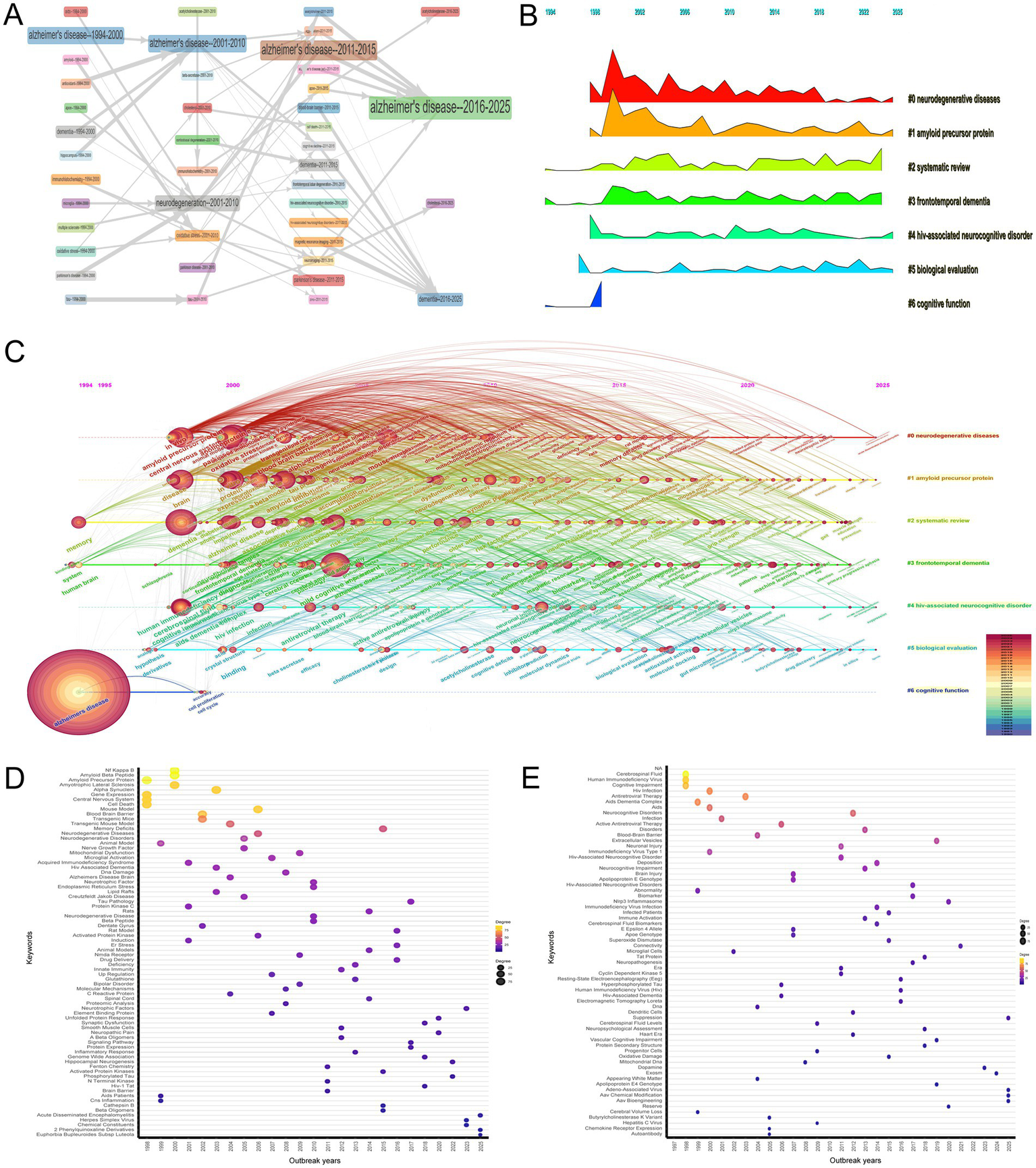 Thematic evolution and research trends. (A) Temporal trends in research themes (1994–2025), transitioning from descriptive pathology (“Alzheimer’s disease,” “AIDS”) to mechanistic insights (“blood–brain barrier,” “MRI”) and recent focus on cholesterol metabolism. The figure reflects the maturation of research toward integrative approaches. (B) Mountain plot illustrating keyword clusters and their peak periods. The “neurodegenerative diseases” cluster (Cluster 0) peaked in the early 2000s, while “HIV-associated neurocognitive disorder (HAND)” (Cluster 4) gained prominence post-2010, reflecting shifts in research emphasis. (C) Timeline visualization of keyword clustering, showing progression from broad neurodegenerative themes to specific investigations into amyloid pathology and biomarkers. Recent trends highlight translational applications of machine learning. (D) Temporal analysis of the “neurodegenerative diseases” cluster (Cluster 0) from 1997 to 2025, highlighting top three keywords for each year: 1997–1999 (“central nervous system,” “gene expression,” “cell death”); 2000–2009 (“amyotrophic lateral sclerosis,” “oxidative stress,” “transgenic mice”); 2010–2019 (“neurotrophic factor,” “endoplasmic reticulum stress,” “synaptic plasticity”); 2020–2025 (“neuropathic pain,” “hippocampal neurogenesis,” “protein misfolding”). (E) Temporal trends in research foci within Cluster 4 HAND from 1997 to 2025, highlighting the top three keywords for each year: “cerebrospinal fluid,” “human immunodeficiency virus,” and “cognitive impairment” (1998–1999); “antiretroviral therapy,” “blood–brain barrier,” and “microglial cells” (2000–2009); “neuronal injury,” “HAND,” and “cyclin-dependent kinase 5” (2010–2019); and “nlrp3 inflammasome,” “adeno-associated virus,” and “aav bioengineering” (2020–2025).