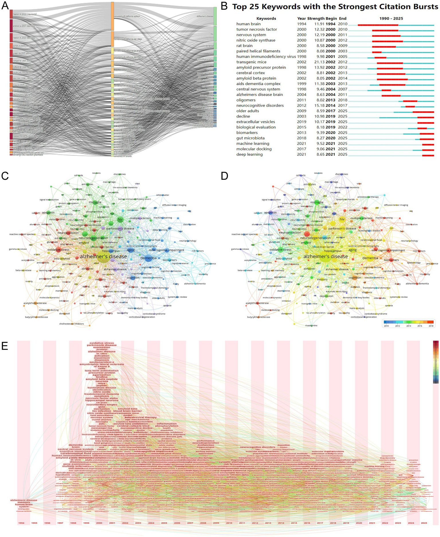 Keyword analysis and research focus. (A) Three-field plot linking key literature, institutions, and keywords. Influential works (e.g., “heaton rk 2011 neurovirol”) are associated with institutions like the University of California System and keywords such as “neuroinflammation” and “blood–brain barrier,” underscoring interdisciplinary knowledge integration. (B) Keyword burst detection chart highlighting emerging trends. Early bursts in “amyloid precursor protein” (2002–2012) transition to recent surges in “machine learning” (2021–2025), reflecting methodological advancements and data-driven research priorities. (C) Keyword co-occurrence network, with node size reflecting frequency. Central terms like “neuroinflammation” (154 occurrences) and “microglia” (115 occurrences) anchor the network, while secondary hubs such as “tau protein” and “oxidative stress” highlight pathological interfaces. (D) Keyword co-occurrence network with node size indicating total link strength and color gradient reflecting recency. Emerging terms like “deep learning” (27 occurrences) and “extracellular vesicles” (26 occurrences) signal translational and technological shifts in research focus. (E) Temporal evolution of keyword centrality (1994–2025), illustrating shifts from descriptive terms (“memory,” “Alzheimer’s disease”) to mechanistic themes (“amyloid beta peptide,” “apoptosis”) and recent emphasis on neuroinflammation and computational methods. The figure underscores the dynamic prioritization of research questions over time.
