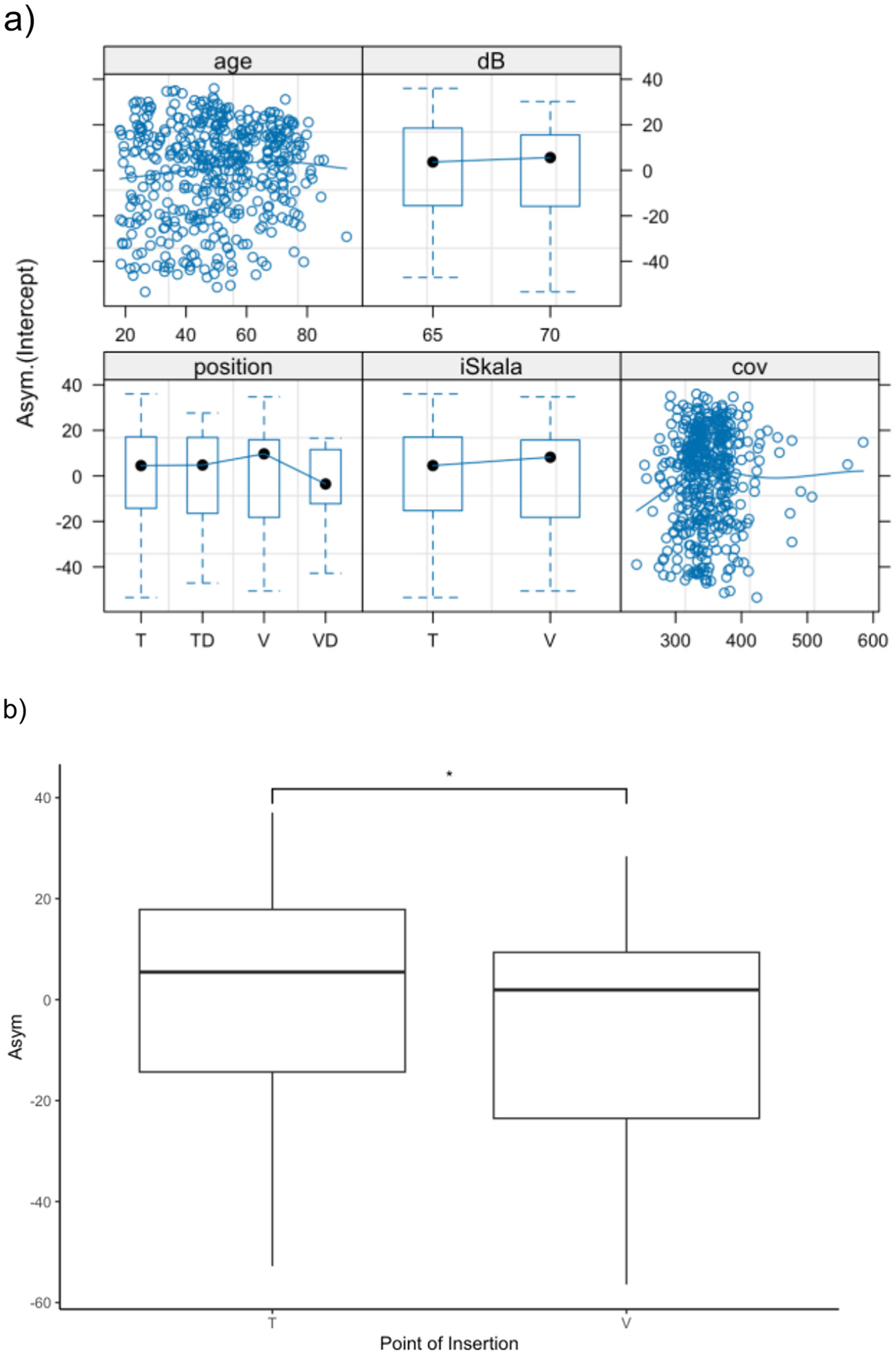 (a) Presentation of the mixed effect model with presentation level as a known factor and modeling the asymptotic value (Asym) for speech discrimination in monosyllables. While we could not find significant influences for age (a), dislocation and coverage, primary scalar insertion (T vs. V) demonstrates significant influence (b). *p < 0.05.