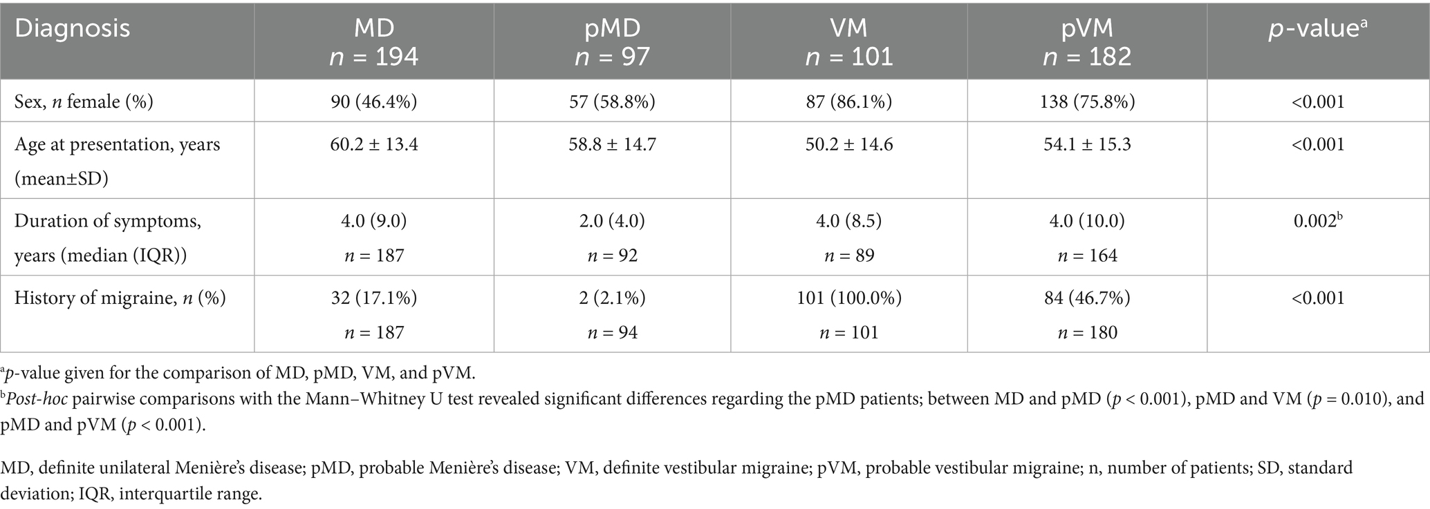An observational cohort study was performed at the Apeldoorn Dizziness Centre, a tertiary dizziness clinic in the Netherlands. Data from all consecutive adult patients who attended an intake visit at the outpatient clinic and were diagnosed with MD or VM between January 2018 and September 2024 were gathered retrospectively from the electronic patient files.