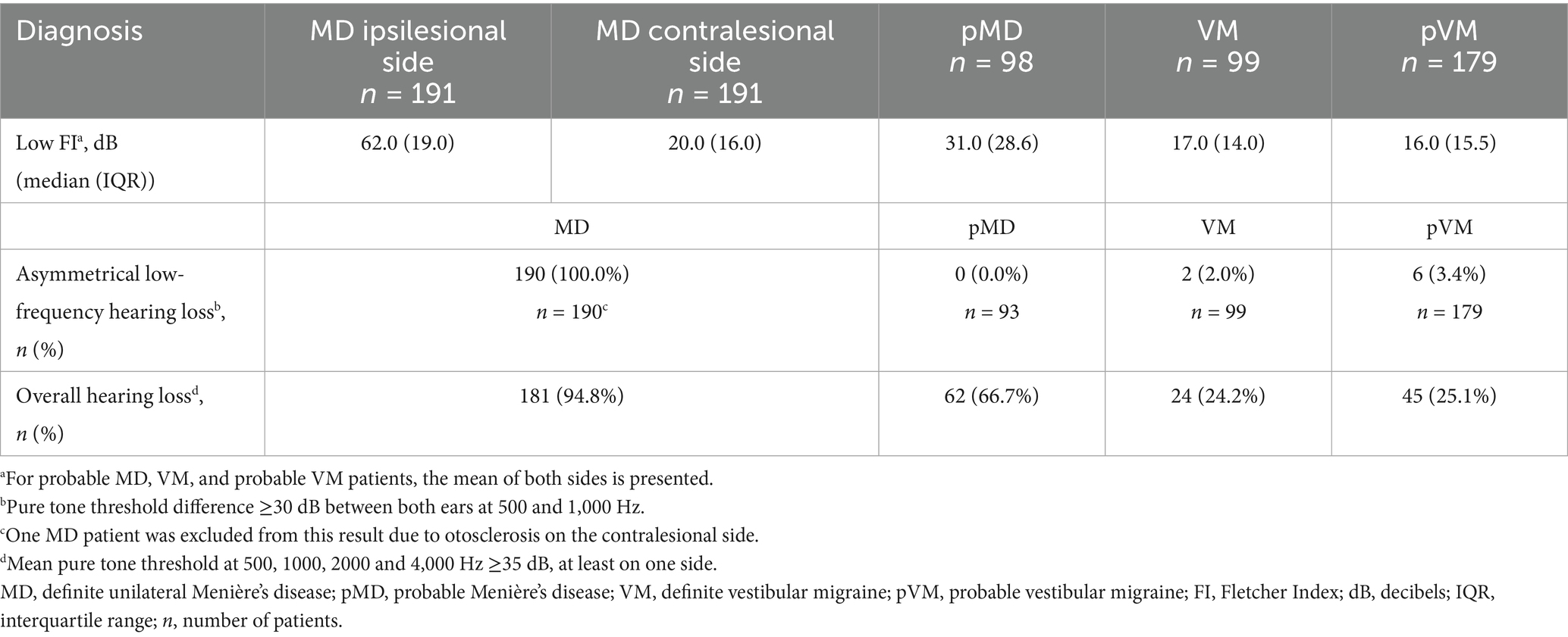 Hearing test results used in the analyses were derived from the pure tone, air conducted thresholds bilaterally at 500, 1,000, 2,000, 4,000 and 8,000 Hz, performed at the initial consultation at our dizziness clinic. Low Fletcher Index was defined as average hearing thresholds at 500, 1,000 and 2,000 Hz (36). High Fletcher Index was defined as average hearing thresholds at 1000, 2000 and 4,000 Hz (37). Overall hearing loss was defined as a mean pure tone threshold ≥35 dB HL at 500, 1,000, 2,000, and 4,000 Hz in at least one ear. This definition was used to describe the general presence of hearing impairment and does not necessarily indicate unilateral or MD-specific hearing loss. To assess for asymmetrical low-frequency hearing loss suggestive of Meniere’s disease, we also calculated interaural differences. Asymmetry was defined as a ≥ 30 dB difference between ears at 500 and 1,000 Hz, in accordance with the Bárány criteria for MD-related hearing loss (2).