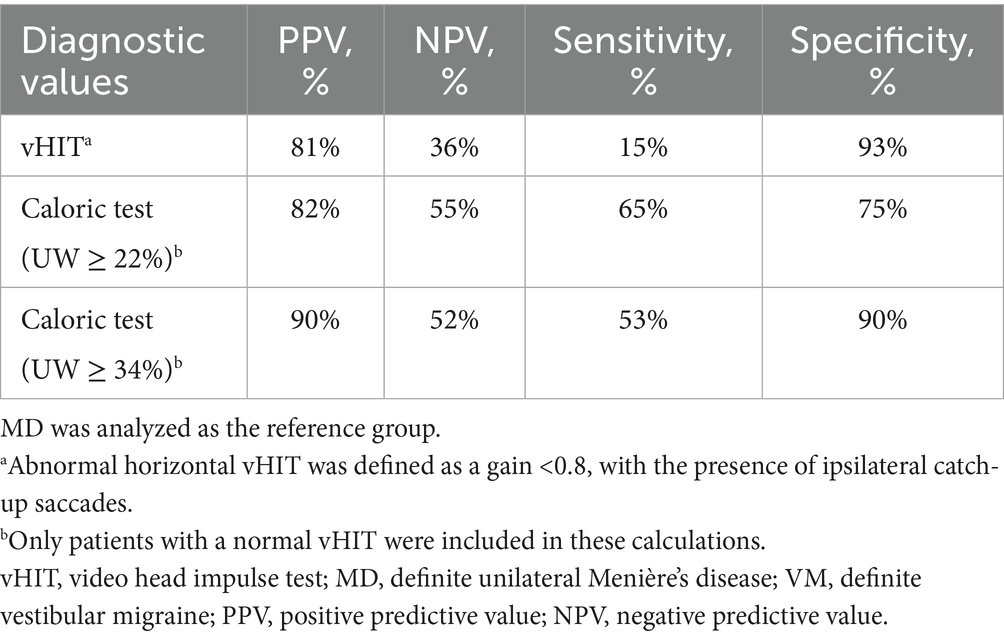 Methods: A cohort study was performed at a tertiary dizziness clinic in the Netherlands in MD and VM patients seen in our clinic from January 2018 until September 2024. Patients were diagnosed based on the Bárány Society criteria. We collected demographic characteristics, symptoms at presentation, results of pure-tone audiometry (PTA), caloric testing, and vHIT. Positive predictive value (PPV) and negative predictive value (NPV) of the vHIT and caloric test were calculated and the optimal unilateral weakness cut-off value was determined.