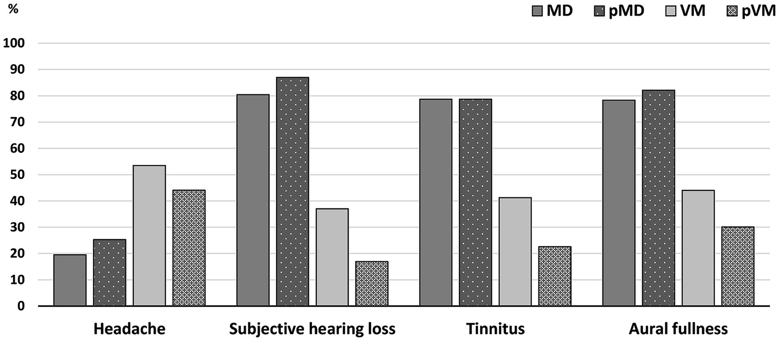 Bar graphs comparing ictal symptoms in MD, pMD, VM, and pVM patients. Presence of ictal headache 19.5% (MD); 25.3% (pMD); 53.5% (VM); 44.1% (pVM). Presence of ictal subjective hearing loss: 80.4% (MD); 87.0% (pMD); 37.0% (VM); 16.9% (pVM). Presence of ictal tinnitus: 78.7% (MD); 78.7% (pMD); 41.2% (VM); 22.6% (pVM). Presence of ictal aural fullness: 78.3% (MD); 82.1% (pMD); 44.0% (VM); 30.1 (pVM). p-value for the comparison of MD, pMD, VM, and pVM reached <0.001 for each symptom. MD, definite unilateral Menière’s disease; pMD, probable Menière’s disease; VM, definite vestibular migraine; pVM, probable vestibular migraine.