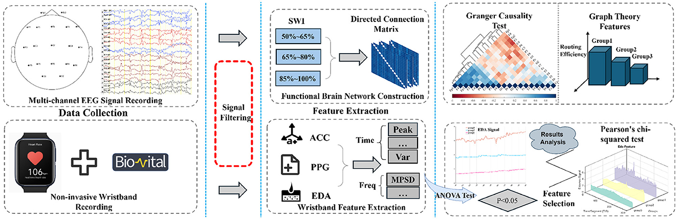 Methods: The research utilizes the “Biovital-P1” software integrated with Oppo smart bands to collect multimodal physiological signals. Simultaneously, a 21-channel digital EEG system acquires electroencephalographic data. The study constructs brain networks through DTF analysis. Additionally, it performs preprocessing and feature extraction on multimodal physiological signals (ACC, EDA, PPG).
